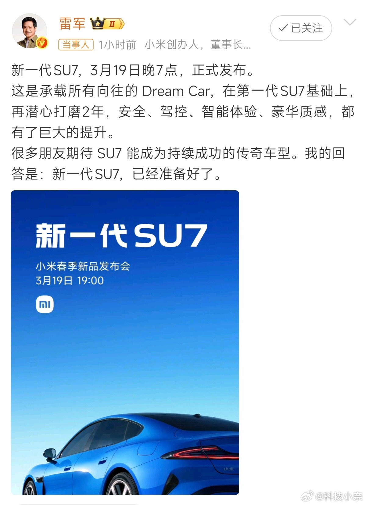 时隔两年,新一代SU7要来了!雷军称新一代SU7准备好了