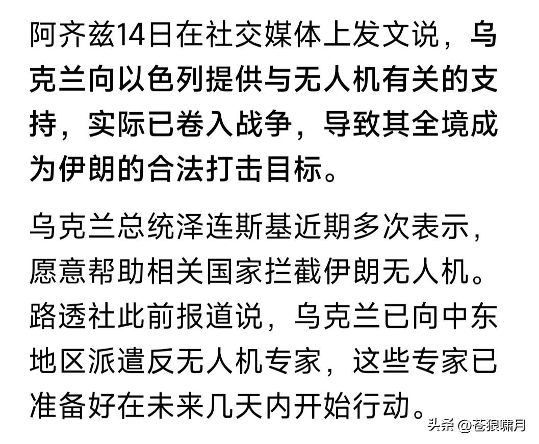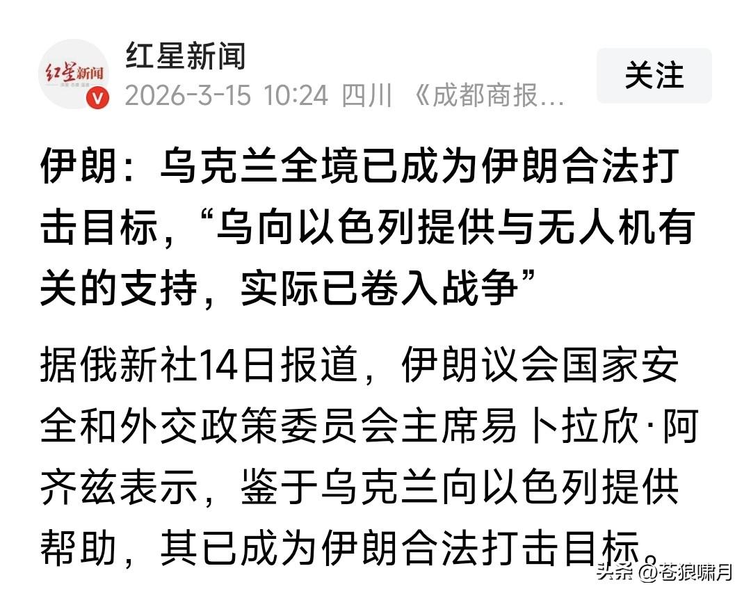 伊朗高官宣布:乌全境将成为伊朗合法打击目标!因为乌向以色列提供“与无人机有关”支持,实际已卷入战争! 此消息令人大吃一惊!本人知道乌答应美方请求,向中东派出“防无人机”专家小组,支持他们防御伊朗无人机。尚不知乌与以色列已经合作这件事情! 如果此事属实,伊高官愤怒可以理解!毕竟乌方在帮助伊朗的“敌人”嘛!但这位高官说的“对乌全境实施打击”!是否能够实现?是否有点强词夺理呢? 1.伊朗离乌克兰有多远?据悉有2500多公里,你有多少能飞到那里的导弹与无人机?即便有,也在与美以对攻战中消耗差不多了。还有几个打到那里? 2.俄乌战争爆发四年,伊朗援助发动战争一方多少无人机?自己心里没数吗?现在乌只对美以与中东部分国家,提供无人机防御装备,就是卷入战争? 苍狼想问的是,美以发动对伊朗战争,有无惩罚伊朗参与俄乌战争因素?觉得应该有,因为哈马斯为何发动“阿克萨洪水”?谁是“哈真胡”的背后“金主”?这位“金主”的背后“老板”又是谁呢? 这世间的道理,谁能说得清楚呢?但事情在那里摆着,只要不是傻瓜,应该都能看出是非对错吧?网友觉得呢? …………