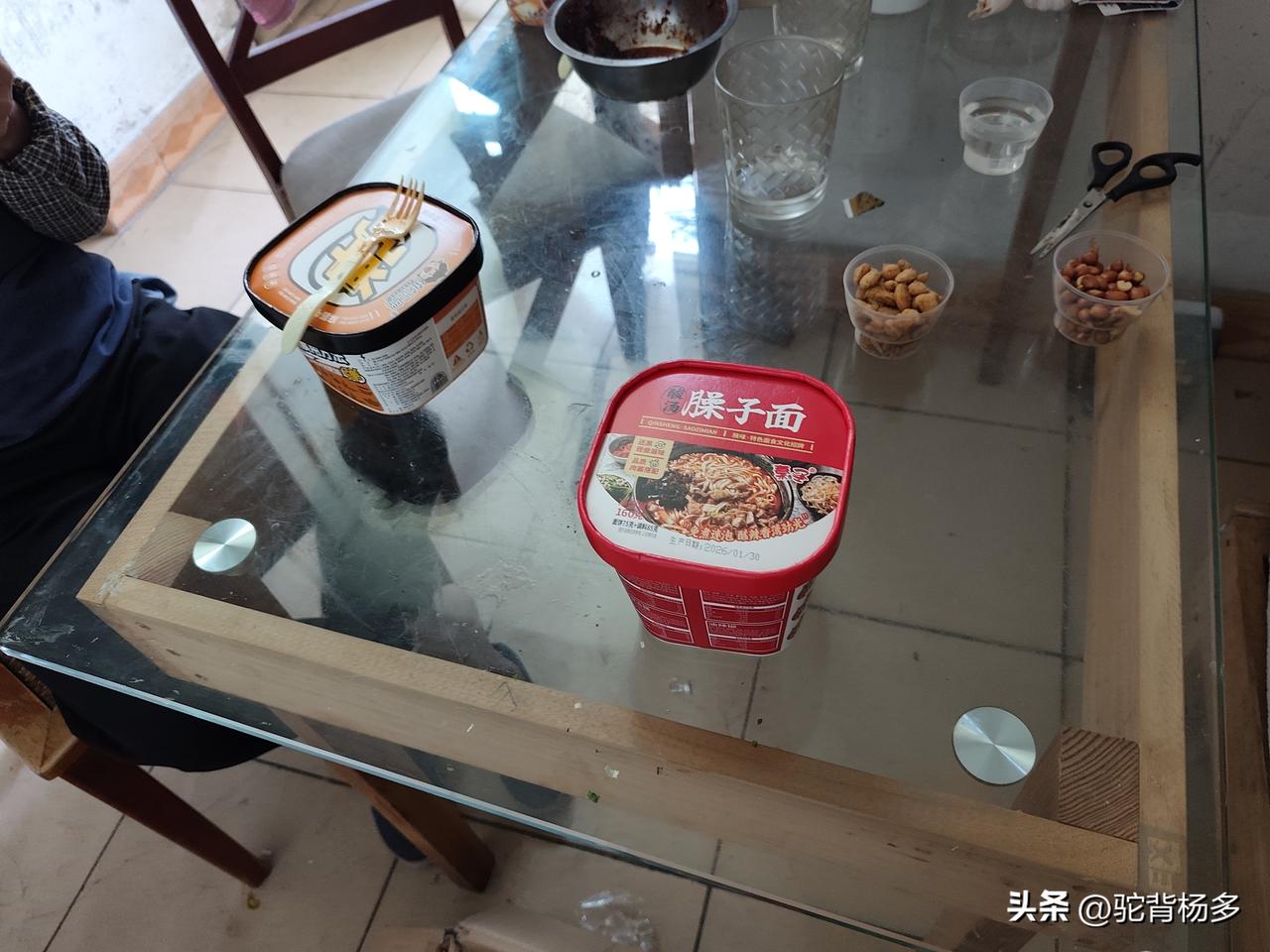 3月14日东莞打工的陕西咸阳人老俩口的伙食堪称奇葩!星期六早晨,我和老伴踏着朝霞去上班,我俩一人吃一个河南人卖的1元/个的粉条包。粉条包比肠粉便宜,肠粉要3元/份。 中午下班了,老婆说她今天上班累,不想做饭了,建议我们吃泡面,于是,老婆吃速食牛筋面,我吃速食臊子面。这两款泡面是家乡味,吃起来有味。 下午下班没吃饭,等晚上21点下班一起吃。晚上,我问老婆吃什么,她说她几块老婆饼就行。我吃了一碗速食炸酱面! 我不喜欢今天,因为今天吃了两顿泡面。