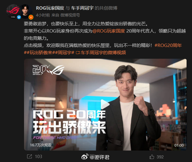 ROG竟然又找小周代言了,你别说这组合还挺合适,ROG20周年代言人对小周来说也