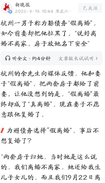 二婚还敢这么玩!浙江杭州,男子花20多万娶二婚妻子回家,婚后,妻子说心里有阴影,两人一直分房睡。男子虽然心有怨言,但刚好赶上妻子家拆迁,他也分到了80平房子,也算一种心里安慰。事后,男子欠了银行11万,为了躲避债务,妻子提出假离婚,离婚不离家,房子暂时放她名下,以后留给孩子。男子信以为真,将两套房都给了妻子,万万没想到,这竟是一个圈套,妻子将他赶出家门并拉黑。 余先生是浙江杭州本地人,44岁的他之前有过一段短暂的婚姻,没留下孩子,离婚后一直独自生活。2023年,经朋友介绍,他认识了同样带着一个女儿的王女士,对方也是二婚,比他小两岁,看起来温柔体贴。 相处几个月后,两人确定了关系,谈婚论嫁时,王女士提出要20多万彩礼,还要在杭州主城区买一套婚房,余先生想着能成个家,咬咬牙凑齐了20多万彩礼,又掏空积蓄付了婚房首付,风风光光把王女士娶回了家。 婚后的日子并没有余先生想象中那么甜蜜,王女士总说自己上一段婚姻留下了心理阴影,不习惯和人同床,提出要分房睡。 余先生虽然心里有怨言,觉得花了这么多钱娶回来的妻子却连床都不让碰,但看着王女士平时把家里打理得井井有条,对他也还算体贴,加上刚好赶上王女士娘家拆迁,他作为女婿也分到了一套80平的安置房,心里的不满慢慢被冲淡,只觉得日子能这样过下去就好。 平静的日子没过多久,余先生因为投资失败,欠了银行11万贷款,催债电话一个接一个,他每天都过得提心吊胆。 王女士看着他愁眉苦脸的样子,主动提出了一个“办法”,说可以先假离婚,把两套房子都暂时放到她名下,这样银行就没法查封房产,等债务还清了再复婚,房子以后还是留给孩子。 余先生一开始还有些犹豫,可架不住王女士软磨硬泡,加上对方信誓旦旦地保证“离婚不离家,只是走个流程”,他最终还是相信了妻子,在离婚协议上签了字,把自己婚前买的婚房和拆迁分得的80平安置房,全都归到了王女士名下。 签完离婚协议后,余先生还像往常一样住在家里,以为只是暂时的权宜之计,可没过几天,王女士就变了脸,趁他外出上班时,把他的行李全都扔到了门外,换了门锁,还把他的微信、电话全部拉黑,彻底消失在了他的生活里。 余先生下班回家发现后,整个人都懵了,他一遍遍敲着家门,可里面再也没有回应,他跑到王女士娘家去找,娘家也说不知道她的去向,甚至连之前分到的80平安置房,也被王女士偷偷挂到了中介平台上准备出售。 44岁的余先生瞬间变得一无所有,不仅没了家,没了两套房子,还背着11万的银行债务,走投无路的他只能坐在小区楼下的长椅上,一根接一根地抽烟,手机里前妻的微信头像已经变成了灰色,电话永远是无人接听的状态,他怎么也想不通,自己掏心掏肺对待的二婚妻子,竟然会设下这样一个圈套,把他骗得干干净净。 后来,余先生在朋友的建议下,找到了杭州当地的法律援助中心,向律师咨询维权的办法。律师告诉他,“假离婚”在法律上并不存在,只要双方在民政局办理了离婚登记,签订了离婚协议,就具备法律效力,余先生自愿将房产赠与王女士,想要撤销难度很大,除非能拿出确凿证据证明自己是被欺诈、胁迫才签的协议。 余先生翻遍了手机,只找到几段和王女士的聊天记录,里面提到了“假离婚”“躲债务”,但这些证据是否能被法院采纳,还需要进一步核实。 这件事被当地媒体报道后,很快在杭州引发了热议,不少网友都为余先生感到惋惜,有人说他太天真,轻易相信了“假离婚”的谎言,也有人指责王女士的行为太过分,利用婚姻骗取财产。 也有律师提醒,现实中很多人会以“躲债务”“避限购”等理由提出假离婚,本质上都是陷阱,一旦办理了离婚手续,财产分割就无法轻易反悔,最终往往落得人财两空的下场。