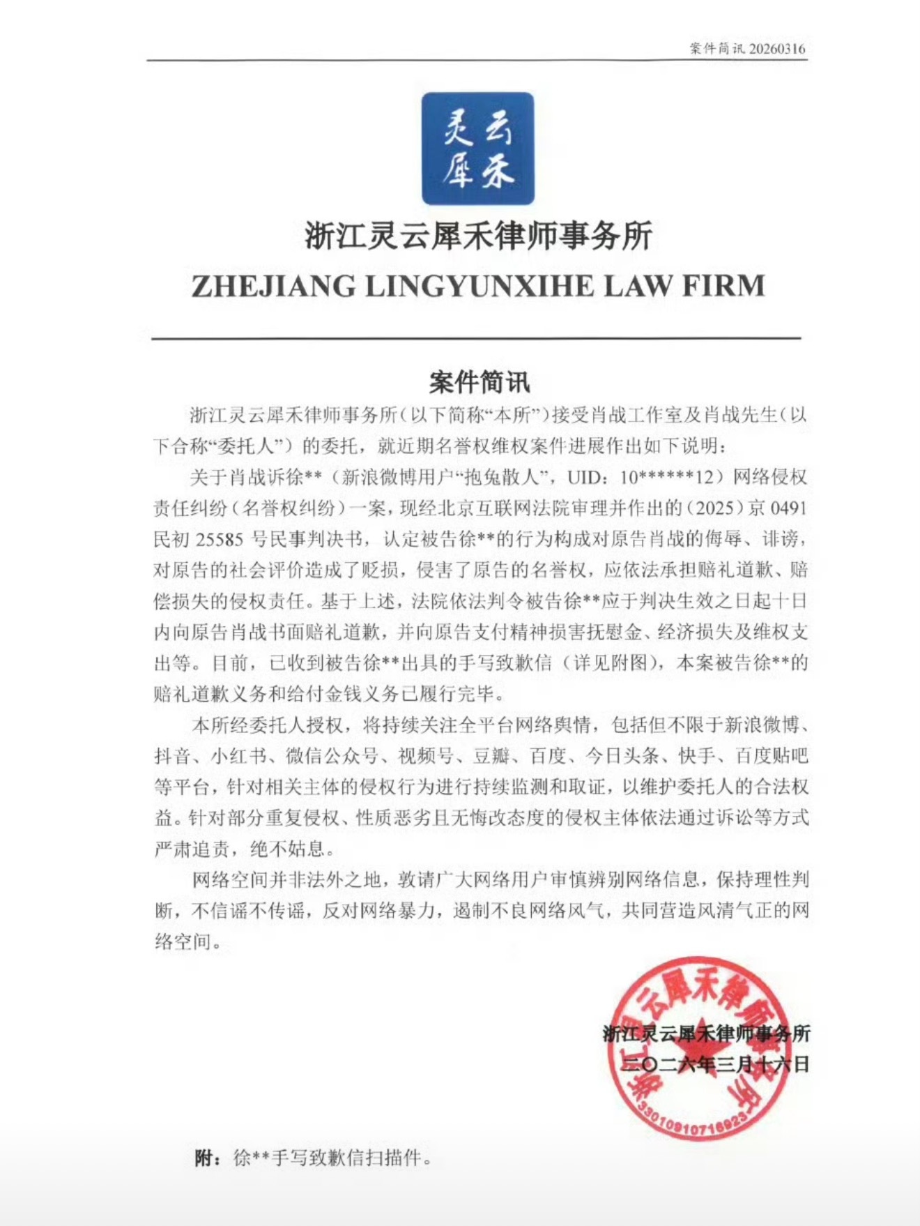 肖战方律师发布了维权声明告的职黑有了进展赔偿➕手写道歉信来了