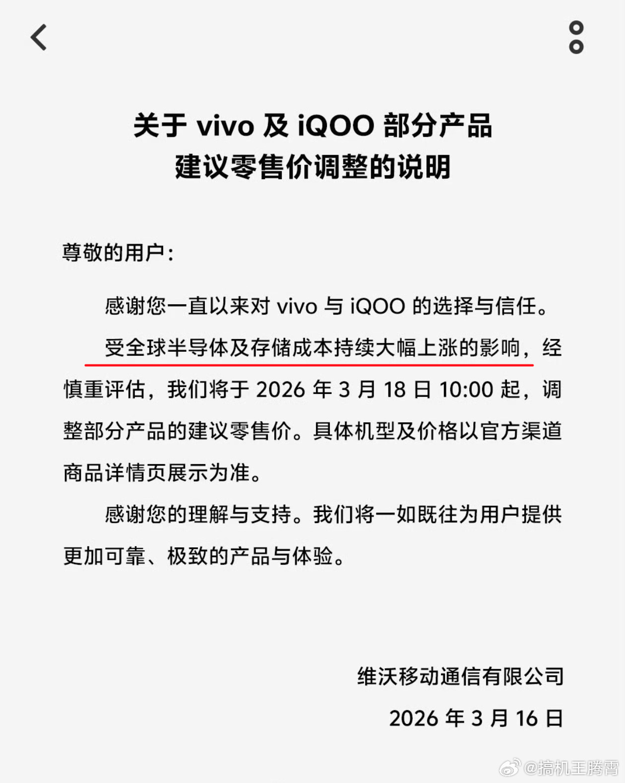 刚刚!vivo、iQOO官宣涨价!3月16日,vivo及iQOO发布调价说明,
