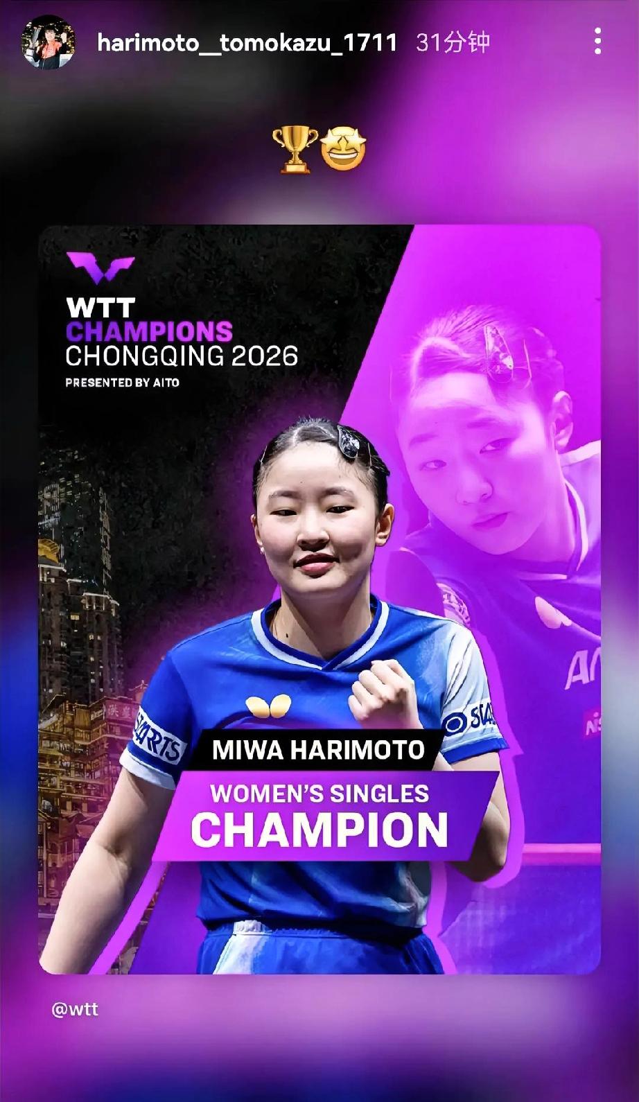 谁还没有个好哥哥呢? 哈里摩托:恭喜我最棒的妹妹MIWA,荣获重庆冠军赛女单冠军!这是17岁的妹妹的第一枚冠军赛金牌,从此大赛有了自己的四分之一区了,再不会早早的遇到世一世二,好激动! MIWA女士:谢谢哥哥!哥哥也很棒! 菲利克斯:谁还没有个好哥哥呢?大布,体现你价值的时候到了! 艾利克斯:来了来了,恭喜我优秀的弟弟荣获重庆冠军赛男单冠军!这是菲利克斯的第二个冠军赛奖杯,可喜可贺啊 菲利克斯:该说不说,半决赛那震耳欲聋的呐喊声加油声让我感受到了主场一般的热情! 艾利克斯:早知道有这么一天,我就应该带着锣鼓🥁和喇叭来! 哈里摩托:你能听懂吗?那么激动! 菲利克斯:你说什么呢?我都知道他们叫我“小布”,我还会说“来,走”!你说我能不能听懂“加油”? 松岛少爷:拜托,从小到大哪次比赛听不到“加油”俩字儿?可惜没有一次是送给我的! 艾利克斯:可不,打乒乓球的多多少少都能说几句中国话吧,最厉害的还是果子哥,语言天赋太发达了 菲利克斯:少爷,跟你商量个事儿呗,你那个系鞋带的姿势能不能换换?吓我一大跳,这让我很有压力呀 松岛少爷:你管我呢,我乐意! 菲利克斯:古人云,男儿膝下有黄金,要不下次我给你备个红包?
