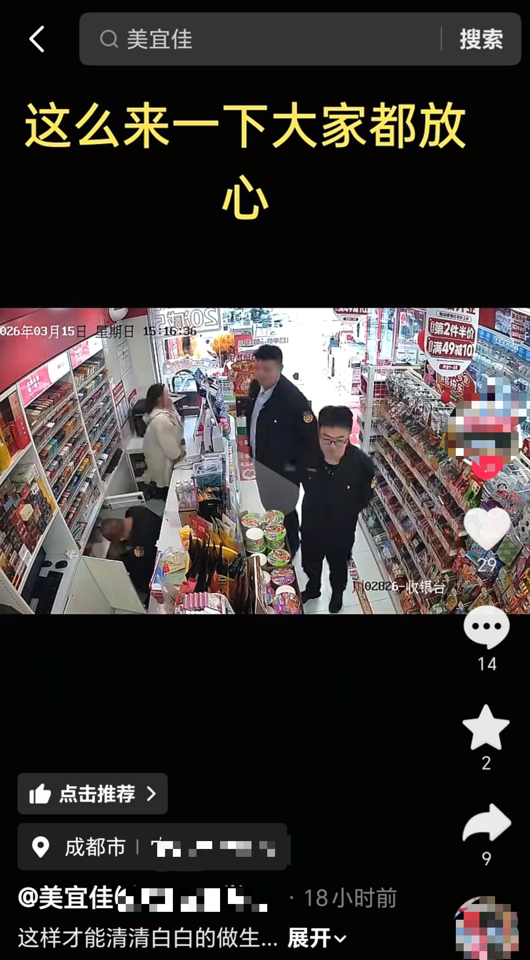 记者注意到,3月15日,四川省成都市一家美宜佳门店店主在社交平台发布执法人员进店检查的监控视频,配文“接受检查与监督,事实才能还我们清白”。在评论区,店主还称:“做点本分生意,这么整,感觉自己好像是罪大恶极的犯罪分子”。