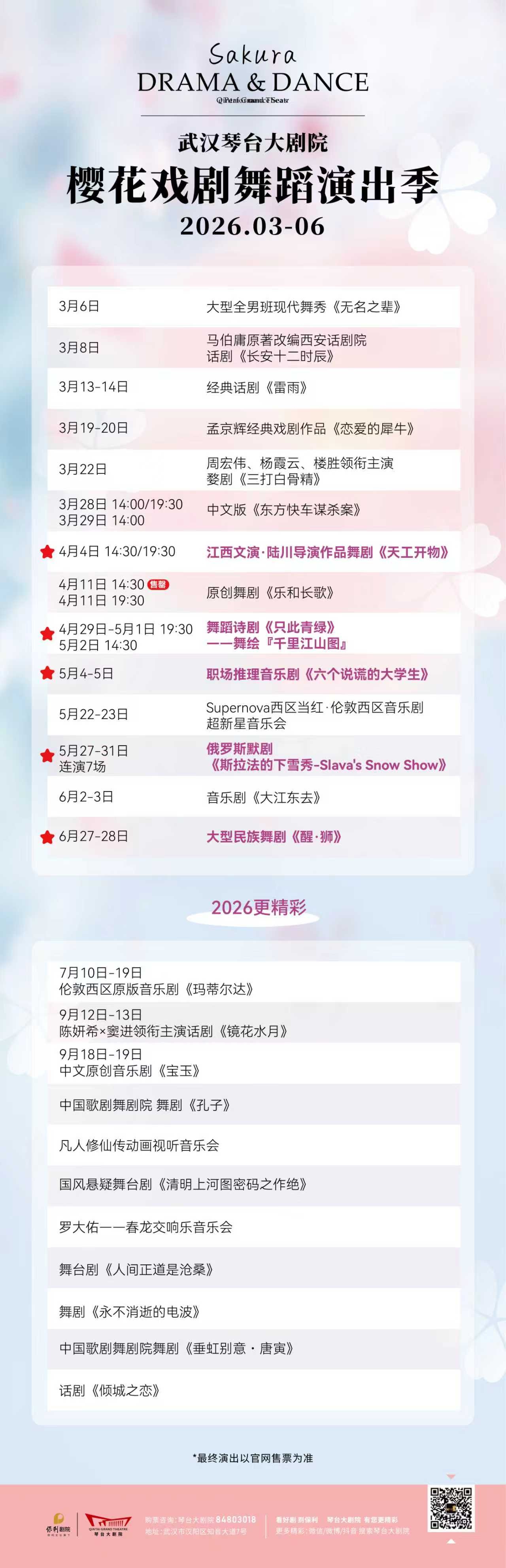 这是一场与春天的约定,更是一次与艺术的深度对话。13部作品,31场演出,每一幕都是匠心独运,每一刻都值得全心沉浸。在樱花飘落的轨迹里,在剧场灯光亮起的瞬间,共同见证2026年这个属于武汉、属于每一位热爱生活与艺术之人的,绚烂夺目的樱花艺术季。