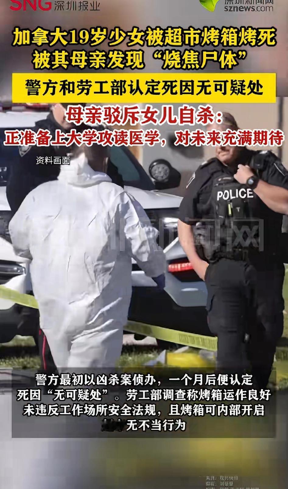 加拿大19岁少女被超市烤箱烤死,被其母发现“烧焦尸体”,警方和劳工部认定死因无可疑处。 母亲驳斥女儿自杀:正准备上大学读医学,对未来充满期待。 2024年10月,加拿大19岁少女Gursimran的遭遇太让人痛心。她和母亲在同一家沃尔玛超市工作,值班时离奇失踪,最后母亲在温度达200℃的商用步入式烤箱里发现了她的烧焦尸体。母亲发现前,因一小时没看到女儿,四处寻找却被员工敷衍。 事发后警方最初按凶杀案侦办,一个月后却称死因“无可疑处”,劳工部也认定超市无不当行为。可Gursimran热爱生活,正计划读大学当医生,家人还收到她生前订的包裹。母亲愤怒反对“自杀”结论,一年多过去,真相仍不明,这真让人难以接受。