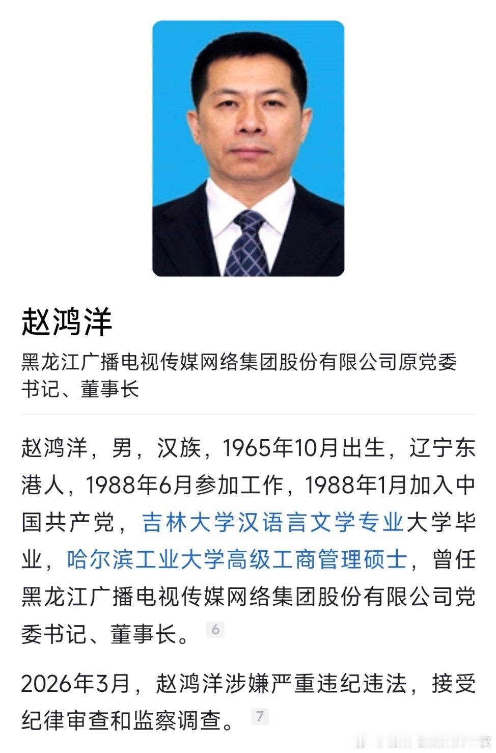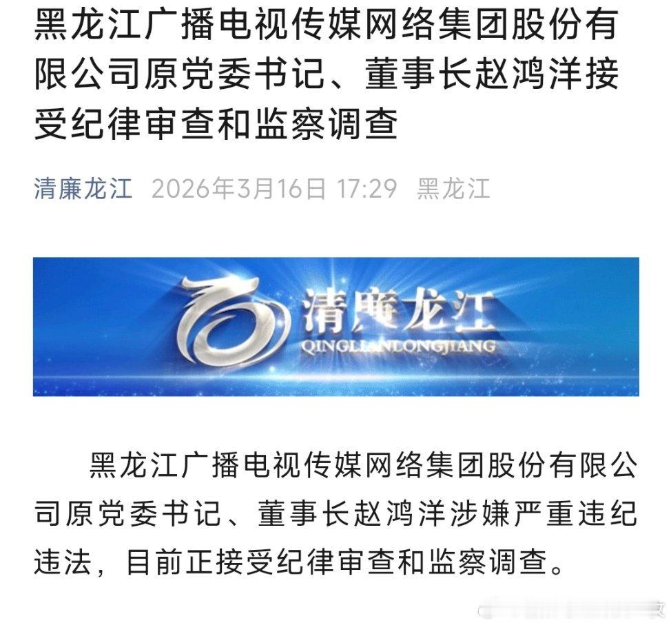 黑龙江广播电视传媒网络集团股份有限公司原党委书记、董事长赵鸿洋接受纪律审查和监察调查。
