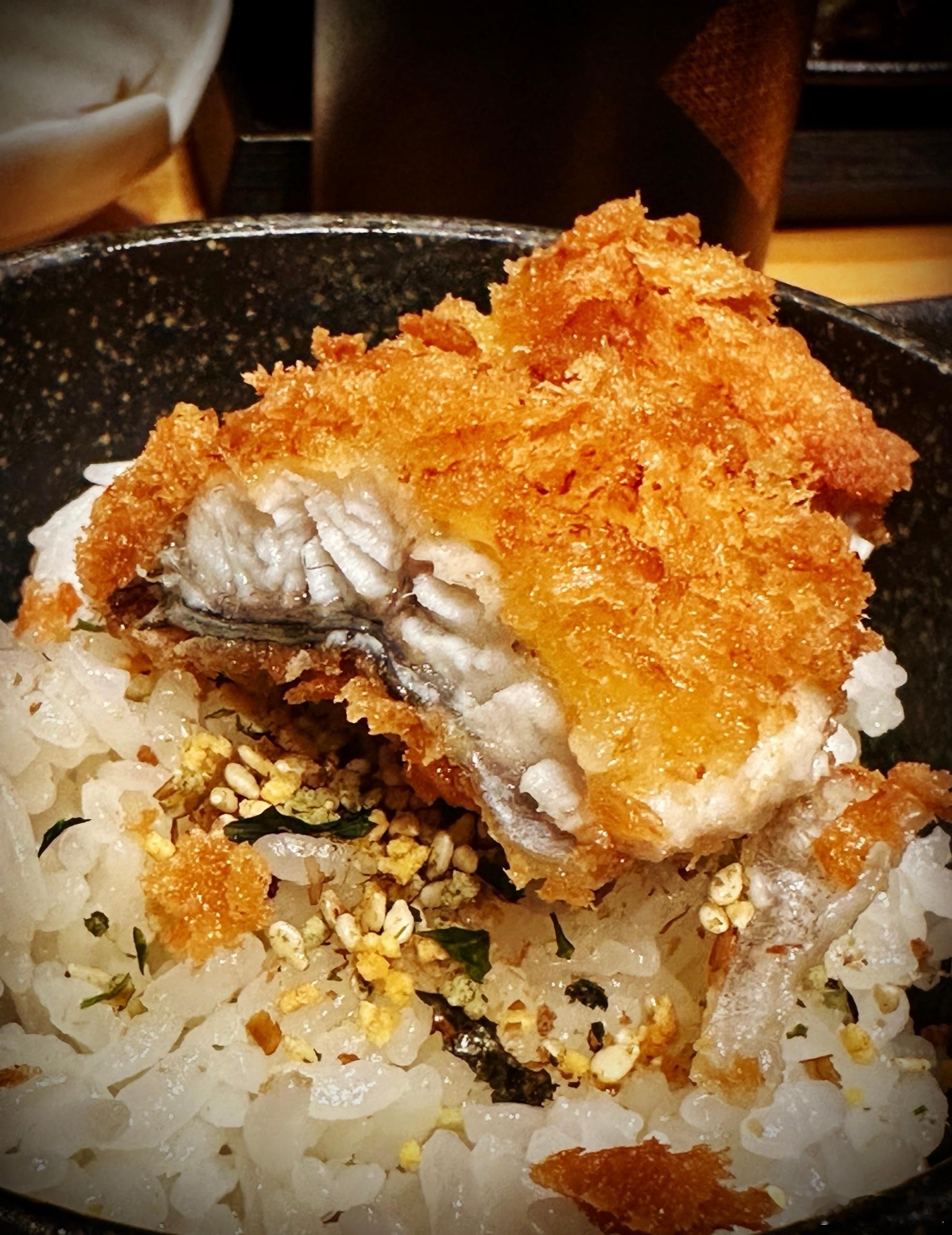 1️⃣烤鳗鱼饭,大厨味道处理比较淡,不像日式蒲烧鳗鱼那么多酱汁,能更好品尝高品质活sha鳗鱼的原味,我特别喜欢,而且鳗鱼盖在饭上满满两层,真舍得给;2️⃣天妇罗鳗鱼饭,搭配一点酸味生菜沙拉,紫苏苹果和柚子腌萝卜,当然美味;3️⃣台式三杯鳗鱼饭,主厨David 是台湾人,所以独创了这一款特别的三杯鳗鱼,蒜头罗勒三杯酱汁…独特、惹味,又送下半碗米饭;4️⃣鹅肝炒饭鳗鱼蛋包饭上桌,其实我们已经每人一份鳗鱼饭吃得很饱,但鸡蛋半凝固色泽诱人,鹅肝炒饭散发诱人香味,再加上鳗鱼,一盆鳗鱼鹅肝炒饭很快又被瓜分完毕。