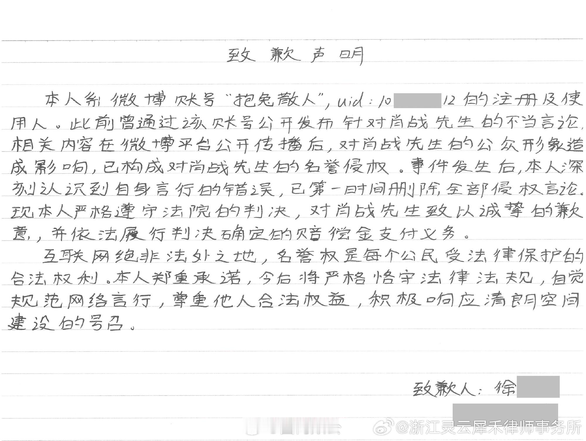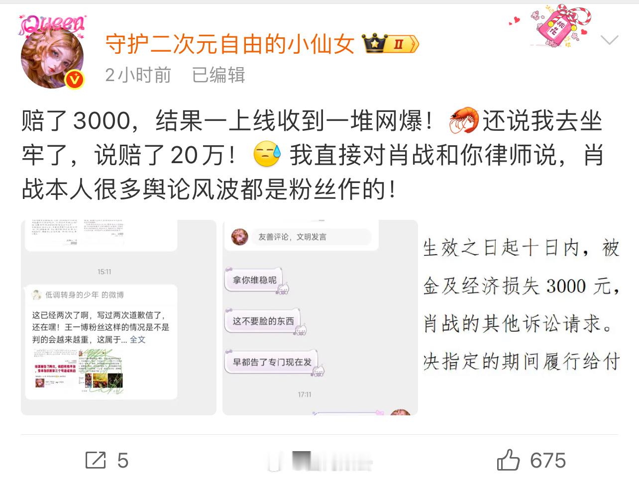 肖战告黑对方声称赔了肖战3000