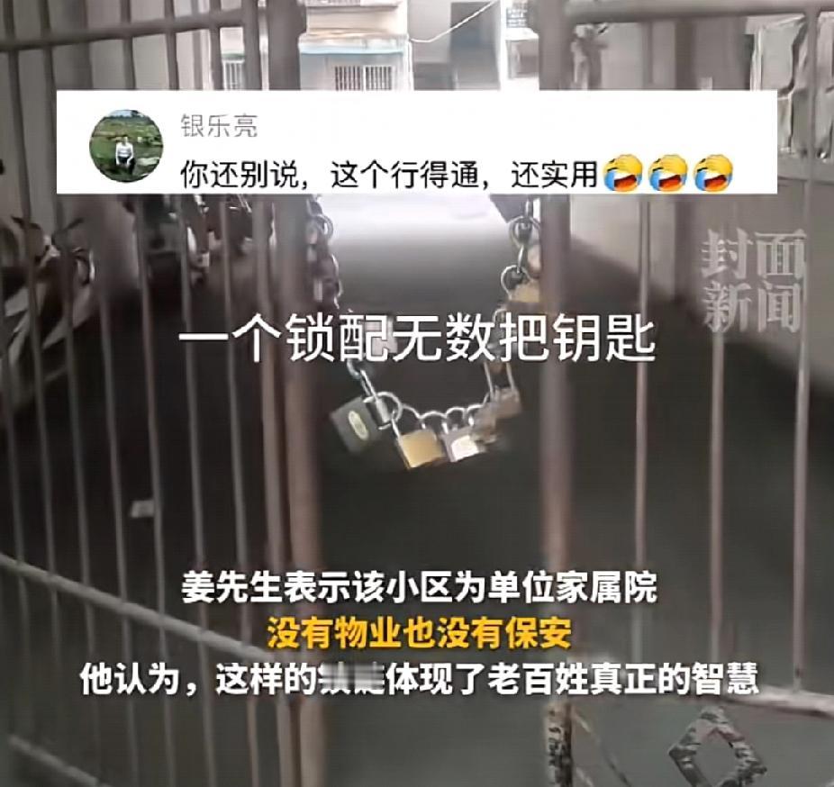 "人怎么可以聪明到这个样子?”四川攀枝花,一小区为了防止外来车辆进入,竟然在小区入户门上挂了29把锁,业主开自家锁即可进入。网友:“这虽然是最便宜的门禁系统,但却使用了超前的“区块链”技术!” 这个小区是上世纪单位分的老家属院,住的全是退休老职工,邻里之间相处得特别和睦,关系铁得很。可老小区的硬件设施跟不上,没有物业没有保安,连个像样的门禁都没有,平时进出全靠大家自觉,时间长了,就出了大麻烦。 随着周边的车越来越多,不少外地司机发现这个小区没人管,为了省几块停车费,就纷纷扭头往院子里钻,老小区本来道路就窄,一共就几十个车位,很快就被外来车辆占得满满当当,小区业主自己开车回来,反倒没地方停车,只能在小区外兜来兜去特别憋屈。 更让人闹心的是,外来车辆一多,小区里的通道经常被堵死,万一发生紧急情况,救护车、消防车都进不来,而且车辆来往的噪音也很大,影响老人们休息。 业主们都憋了一肚子气,商量着怎么解决这个问题,一开始想过装智能门禁,问了报价,动辄几千块,家家户户平摊下来也不少钱,而且后期还有维护费,特别不划算。 后来又有人提议请保安,可保安的工资得持续发放,一群退休老职工,退休金本来就不多,长期下来根本扛不住,就这样一个又一个解决方案被否决,大家陷入了僵局,每次聊到外来车辆的事儿,都愁眉不展。 转机出现在一个夏天的傍晚,几个老哥们坐在院子里的树下乘凉,聊来聊去,又说到了外来车辆乱停的心病,就在大家一筹莫展的时候,有位大爷突然拍了下大腿,想出了一个绝妙的点子,既然搞不定高科技,那咱们就靠体力活解决,每家出一把锁,全串在大门的铁链上,谁要开车进门,就拿自家的钥匙开自家那把锁,外人没有钥匙,自然就进不来了。 这个点子一出来,立马得到了大家的认可,第二天一早,小区里的老人们就纷纷去五金店买锁,有的喜欢圆锁,有的喜欢方锁,大家精挑细选,把自己的那把锁带回了家,很快29把锁就整整齐齐地挂在了小区大门的铁链上,看着虽然有些乱糟糟,但却格外实用。 其实这办法的原理很简单,就跟串联电路一样,只要打开其中任意一把锁,整条铁链就松了,车辆就能顺利进门,进门后再把锁原样锁好,一点也不耽误其他业主进出,而且大家也考虑得很周到,这29把锁只防四个轮子的外来车辆,行人和电动车可以随便进出,没必要把大门关得死死的,既方便了自己,又解决了麻烦。 更让人惊喜的是,这个“门禁系统”的成本便宜到离谱,29把锁加起来才一百来块钱,比起动辄几千块的智能门禁,省了一大笔钱,而且不用交电费,后期维护也简单,要是哪把锁坏了,自己去五金店买一把新的装上,也就几块钱的事儿,省心又省力。 一开始还有几个爱体面的邻居觉得,大门上挂这么多锁,乱糟糟的,看着像监狱围墙,不太好看,可只用了不到两周,大家就彻底改变了想法,因为外来车辆彻底消失了,业主们自己的车位稳稳当当的,下班回家再也不用兜圈子找车位,小区里也变得安静了很多,闲杂人等也不敢随便进来了。 后来有路人路过这个小区,看到大门上挂着29把锁,觉得特别新奇,就拍了照片发到网上,没想到一下子就冲上了热搜,引来很多网友围观,网友们看傻了眼,纷纷留言调侃,有人说这哪里是锁啊,这分明是民间物理版区块链,每把锁都是一个节点,分布式管理,还没有维护费太聪明了。 还有很多网友点赞,说别嫌这个办法土,能花最少的钱,解决最糟心的麻烦,就是最聪明的方案。现在要是去这个老家属院转转,就能看到院子里的车辆停得整整齐齐,老人们吃完饭在院子里遛弯、聊天,脸上全是笑容,特别惬意。 那29把锁依然挂在大门上,风吹日晒,风一吹就发出嘎啦嘎啦的响声,在别人听来可能有些刺耳,但在这个小区的老邻居们听来,这声音比手机提示音还顺耳,它们不用电力,没有复杂的构造,却用最土、最实在的方式,守住了这片老家属区的安稳日子,也让大家看到了普通人的智慧,不得不说,这群老人是真的聪明。