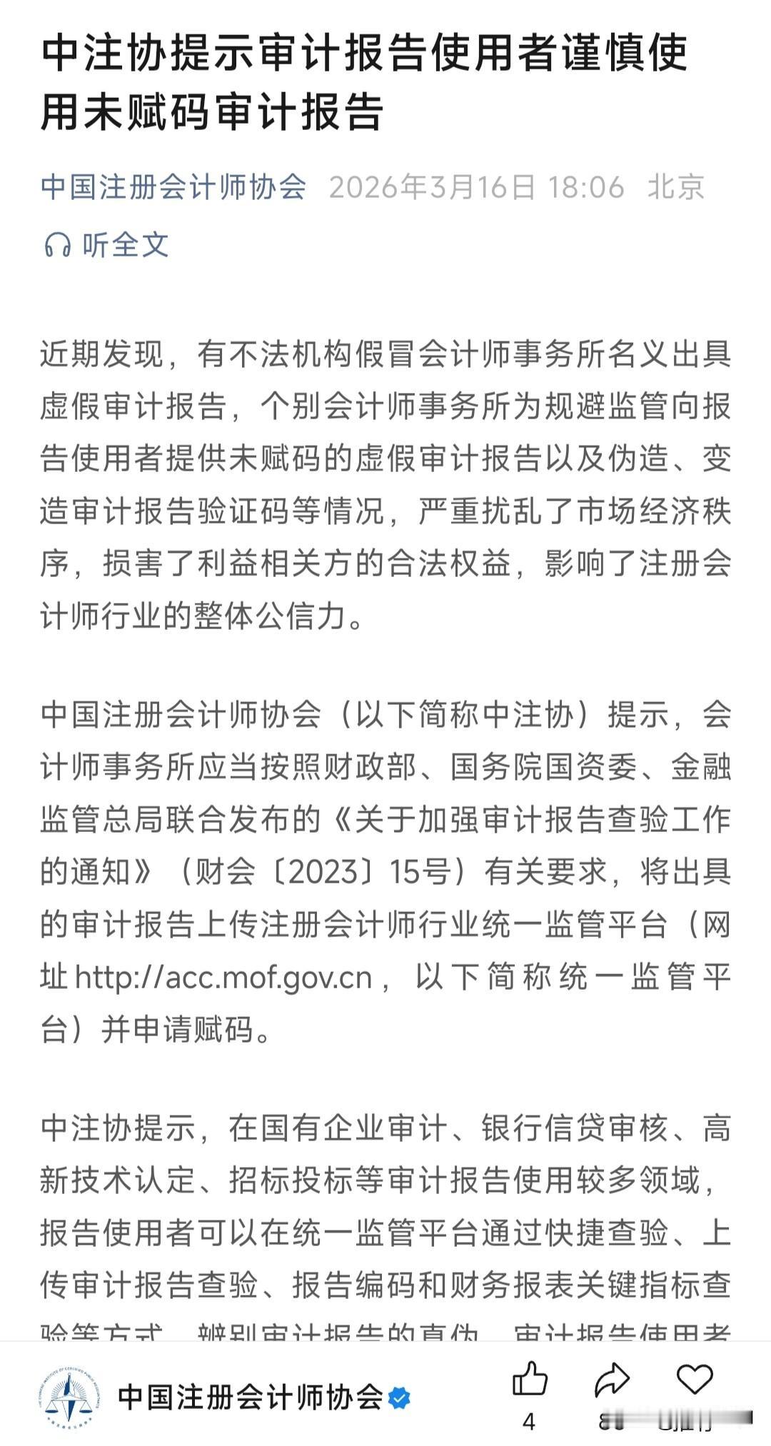 审计报告赋码是行业协会icon的协会行为,这个行为在法律上是什么性质法律上没有定义,赋码与未赋码报告的法律效力到底是什么关系呢?如何法律界定这个赋码呢?有关部门应该就此做出说明,这个赋码行为是背书行为还是登记能不能备案?它和报告本身的关系又是什么呢?未赋码报告到底使用?
