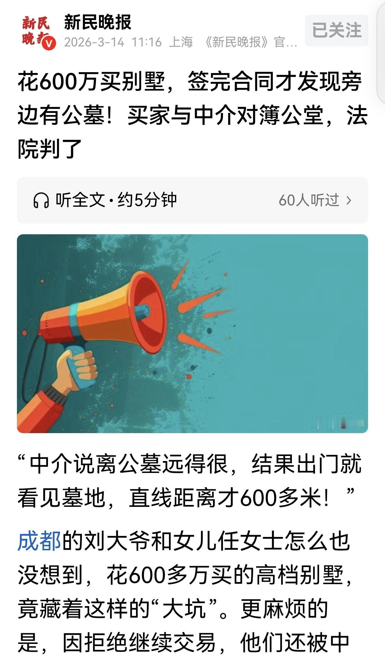 四川成都,一6旬大爷,通过中介,看上了300多平,总价600多万的大别墅,女儿怕他被忽悠,反复跟中介确认,别墅离公墓远不远?中介拍着胸脯说“远得很”,可签完购房合同,交了20万定金,大爷和女儿一走出小区的另一扇门,直接傻眼,马路对面竟然就是公墓,直线距离才600多米!推开窗户就能看到墓碑。大爷一气之下,20万定金也不要了,说啥都不买了,中介不干了:不买可以,40000元中介费和违约金,一分都不能少,还把大爷告上法庭,法院判决让人大呼意外。 年过六旬的刘大爷打拼一生,攒了不少钱,到了该安享晚年的时候。 他想改善一下居住条件,买一套大别墅住,能种花种菜,怡然自得。 2024年初,他通过一家房产中介,看中了一套300多平、总价600多万元的大别墅。 当然了,卖房子对于每个家庭来说,都不是小事,何况600多万的大别墅。 刘大爷的女儿任女士,怕父亲被中介忽悠了,就加了对方的微信,想多了解一下房子的情况。 买房子不但看地段,周边的配套,环境,还要看风水,任女士不止一次的跟中介确认,别墅离公墓远不远? 中介工作人员拍着胸脯保证“远得很”,还发来小区楼栋分布图。 任女士一看中介说的斩钉截铁,也就吃了一颗定心丸,父女俩4月9日,也没实地验证中介的说法,竟然直接交20万定金,签了合同。 可钱交了,合同签完了,父女俩在别墅区转悠,从另外一扇门走出别墅区,眼前的一幕,让他们当场傻眼,追悔莫及。 别墅区马路斜对面,一座公墓清清楚楚地映入眼帘,看的那叫一个瘆人,一想到以后和逝者为邻,父女俩当即起了一身鸡皮疙瘩。 任女士用手机地图一查,别墅和公墓直线距离才628米,就算步行也不过800多米,我滴个乖乖,这别墅说啥都不能要了,谁敢来住? 刘大爷气得直跺脚,说好的远得很,这推开窗都能看到墓碑了! 刘大爷立刻要求中介退房,但中介好不容易把房子卖出去了,当然不愿意泡汤。 也不知道是原房主真不愿意出面,还是中介从中作梗,反正就是拖着不给解决。 刘大爷一咬牙,直接20万定金不要了,决定及时止损,谁让自己这么粗心大意,中介说啥信啥,自认倒霉吧,就当买个教训。 万万没想到,几个月后,中介居然把刘大爷父女告上了法庭,说他不买房子可以,但4万元中介费和违约金一分不能少,毕竟他们跑前跑后,不能白忙活。 而且,刘大爷是成年人,当初看房子的时候,就应该知道附近有公墓,如今又拿这个当借口毁约,中介不接受。 中介的辩解,可把刘大爷气的不轻,自己搭进去了20万,还没找中介算账,他倒恶人先告状,还有脸要中介费,还好意思提违约金? 是中介说公墓离别墅区很远,有聊天记录为证,他之所以没现场求证,是出于对中介的信任。中介骗人在先,房子又没买成,自己凭啥支付中介费? 刘大爷父女买房遭遇“公墓惊魂”,着实闹心。 中介为促成交易,信口保证公墓离得远,严重失职,违背诚信原则。 而刘大爷父女仅听中介一面之词,未实地核实,自身也有疏忽。 法院判决双方都担责,合理公正。这也给大众提了个醒,买房是大事,不能全信中介,自己得实地考察。 中介也得诚信经营,如实告知信息,不然既砸招牌又担责,得不偿失。 《民法典》第962条规定,中介人应当就有关订立合同的事项向委托人如实报告。 本案中,中介未如实告知别墅与公墓实际距离,未尽到如实报告义务,存在过错。 但中介提供带看等服务,刘大爷父女未实地核实也有疏忽。法院综合双方过错,判决支付部分中介费,符合法条精神,维护了双方合理权益。 最终,法院判决刘大爷父女支付1.2万元中介费,驳回了中介其他诉求。 对此,你怎么看?