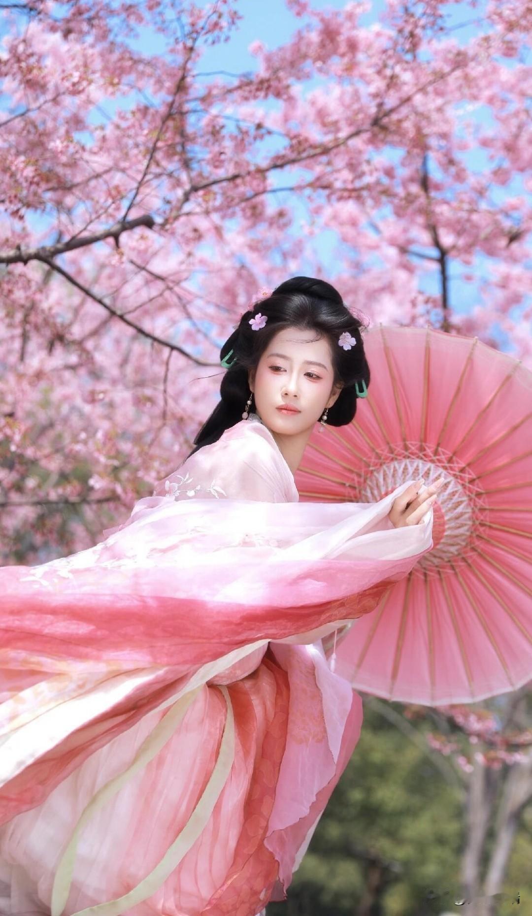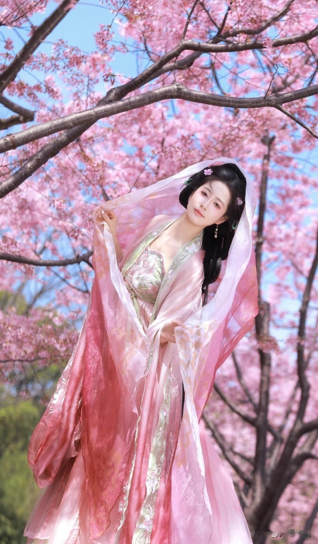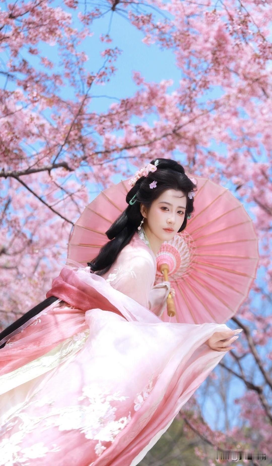 粉色汉服、繁花、蓝天 开春先当一回花仙吧!