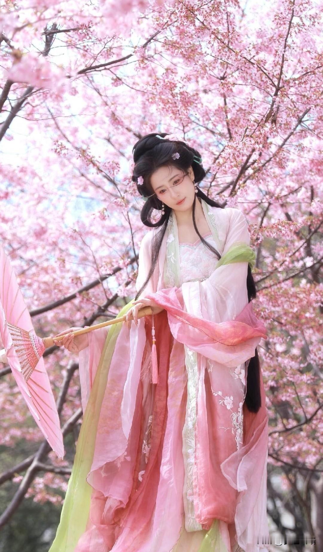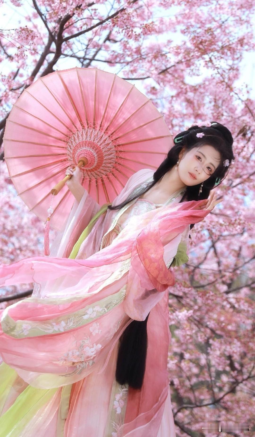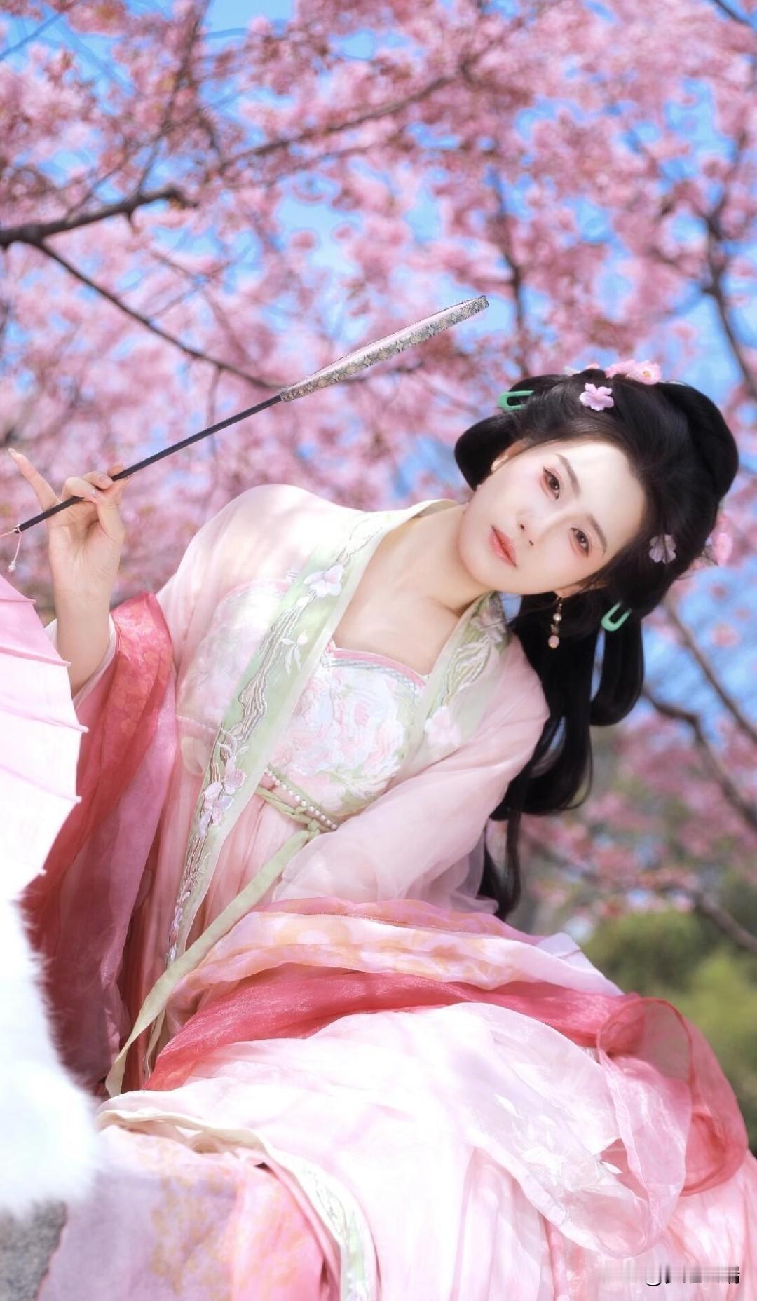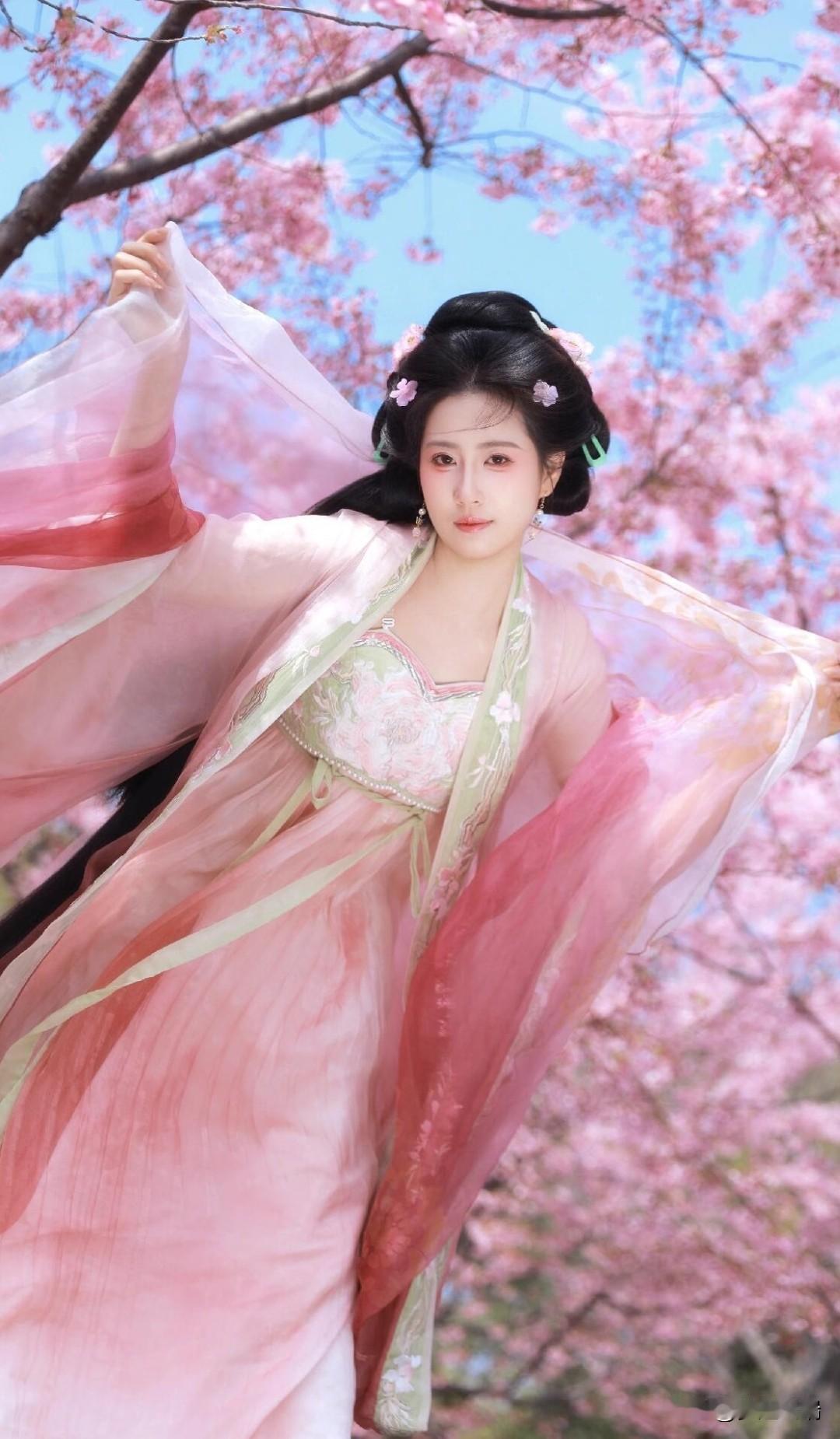 粉色汉服、繁花、蓝天 开春先当一回花仙吧!
