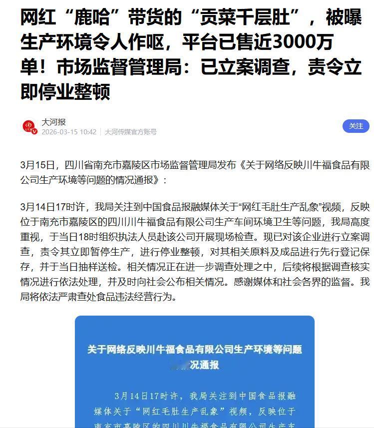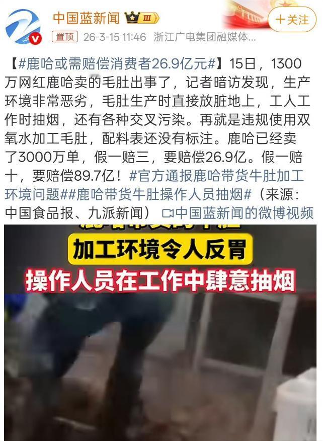 鹿哈估计要坐牢,这比小杨哥严重多了 2026年3月16日,315消费者权益日的热度还没完全褪去,一则千层毛肚的卫生丑闻就火速引爆全网,把近千万粉丝的网红鹿哈推上了舆论风口。 不同于以往网红带货的小打小闹,这次鹿哈面临的不是简单的罚款道歉,而是可能身陷囹圄的危机,其性质之恶劣、后果之严重,远比之前小杨哥的虚假宣传争议要严重得多。 鹿哈本名凌达乐,早年只是一个普通的电子厂打工者,没背景没资源,靠着模仿明星、组建ESO“盗版男团”慢慢出圈。 后来转型做直播带货,他抓住了流量风口,不仅积累了近千万粉丝,还创办了自己的MCN机构,甚至曾嚣张地自曝,仅仅带货7个月就赚了3500万。 从底层打工者逆袭成带货顶流,这样的人生剧本本应被称赞,可他却在流量和利益面前迷失了方向,把粉丝的信任当成了收割财富的工具。 这次引爆舆论的,是他直播间的爆款产品——千层毛肚。 这款毛肚在他的直播间里,被描述成“现做现卖、干净卫生”,鹿哈每天在镜头前拍着胸脯承诺“假一赔十”,靠着这样的宣传,这款产品被他近乎垄断销售,累计销量一路冲到了近3000万单,背后是3000万个家庭的餐桌期待。 谁能想到,这些被消费者寄予信任的毛肚,竟是在脏乱不堪的车间里生产出来的。 3月14日,中国食品报率先曝光了这款毛肚的生产乱象,视频画面让人看得头皮发麻、直犯恶心。 镜头里的四川川牛福食品有限公司车间,乱得像个垃圾场,工作人员一边干活一边叼着烟,烟灰随手飘落在食材堆里,连手都不洗就直接接触毛肚; 煮好的毛肚没有任何防护,直接摊在破损、积水的地面上冷却,工人随手拿起铁锹一铲就装进筐里,全程没有任何卫生防护。 更让人揪心的是,这款毛肚的泡发环节,还疑似违规使用双氧水——这种学名叫过氧化氢的工业漂白用品,残留超标会灼伤消化道,而产品配料表上却压根没有标注,属于明晃晃的隐瞒。 视频曝光后,监管部门的动作十分迅速。 3月14日当天傍晚,南充市嘉陵区市场监管局就赶赴涉事工厂,当场立案调查、责令停业整顿、封存原料成品并抽样送检,一套流程毫不拖沓。 南充市监局随后表态,会根据调查结果依法处理,暗示后续可能有更重的处罚。 更关键的是,这件事刚好撞在了食品安全新规施行的节骨眼上。 3月20日,两部全新的食品安全新规将正式落地,明确要求直播平台管好直播间的人和货,压实主播、MCN机构和平台的主体责任,鹿哈的行为无疑是公然触碰红线,成为新规施行前的典型反面教材。 随着调查深入,鹿哈面临的麻烦越来越大,最直观的就是巨额赔偿。 根据灰豚数据测算,按《食品安全法》“退一赔三”标准,赔偿金额高达26.9亿元; 若兑现“假一赔十”承诺,总额会飙升到89.7亿元。 这笔天文数字,别说鹿哈个人,就算是头部MCN也扛不住,一旦落实,其公司必然资金链断裂、面临破产。 目前,鹿哈所属公司客服已表态,会先行垫付退费并给予三倍补偿,承诺7个工作日到账,但这笔赔偿最终谁来兜底,至今还是未知数。 很多人会把这件事和小杨哥的虚假宣传争议作对比,但两者性质天差地别。小杨哥只是夸大产品功效,属于违规,罚钱道歉就能翻篇; 而鹿哈涉及食品安全,直接关系千万人身体健康,一旦查实严重违法,面临的不只是民事赔偿,还有牢狱之灾。 参考2025年四川法院审理的首例直播带货虚假广告案,主播因虚假宣传被认定为虚假广告罪、判处有期徒刑,这也意味着,鹿哈若被查实违法,坐牢绝非空谈。 鹿哈的事件,不只是他一个人的危机,更是给整个直播带货行业敲了警钟。 这些年,直播带货野蛮生长,流量为王成了潜规则,很多主播只看重佣金,选品把关流于形式,就像不久前被曝光的网红锅巴,生产车间污水横流,和鹿哈毛肚事件如出一辙。 这些主播忘了,流量从来不是遮羞布,选品把关是法定责任。根据《网络直播营销管理办法(试行)》,违反相关规定构成犯罪的,会依法追究刑事责任,直播带货从来不是法外之地。 3000万单毛肚,击碎的不只是千万家庭的餐桌期待,还有消费者对直播带货行业的信任。 信任建立起来难,摧毁却只需要一瞬间,一旦消费者失去信任,整个行业都将面临寒冬。 鹿哈从电子厂打工少年逆袭成顶流,本该珍惜机会、坚守底线,却心存侥幸、铤而走险,最终把一手好牌打得稀烂。 目前,涉事毛肚的送检结果还未公布,鹿哈最终是否会坐牢、赔偿能否落实,仍需等待监管部门调查。 但可以肯定的是,舌尖上的安全是全社会的底线,不管是主播、还是生产企业,敢突破红线就必须付出代价。