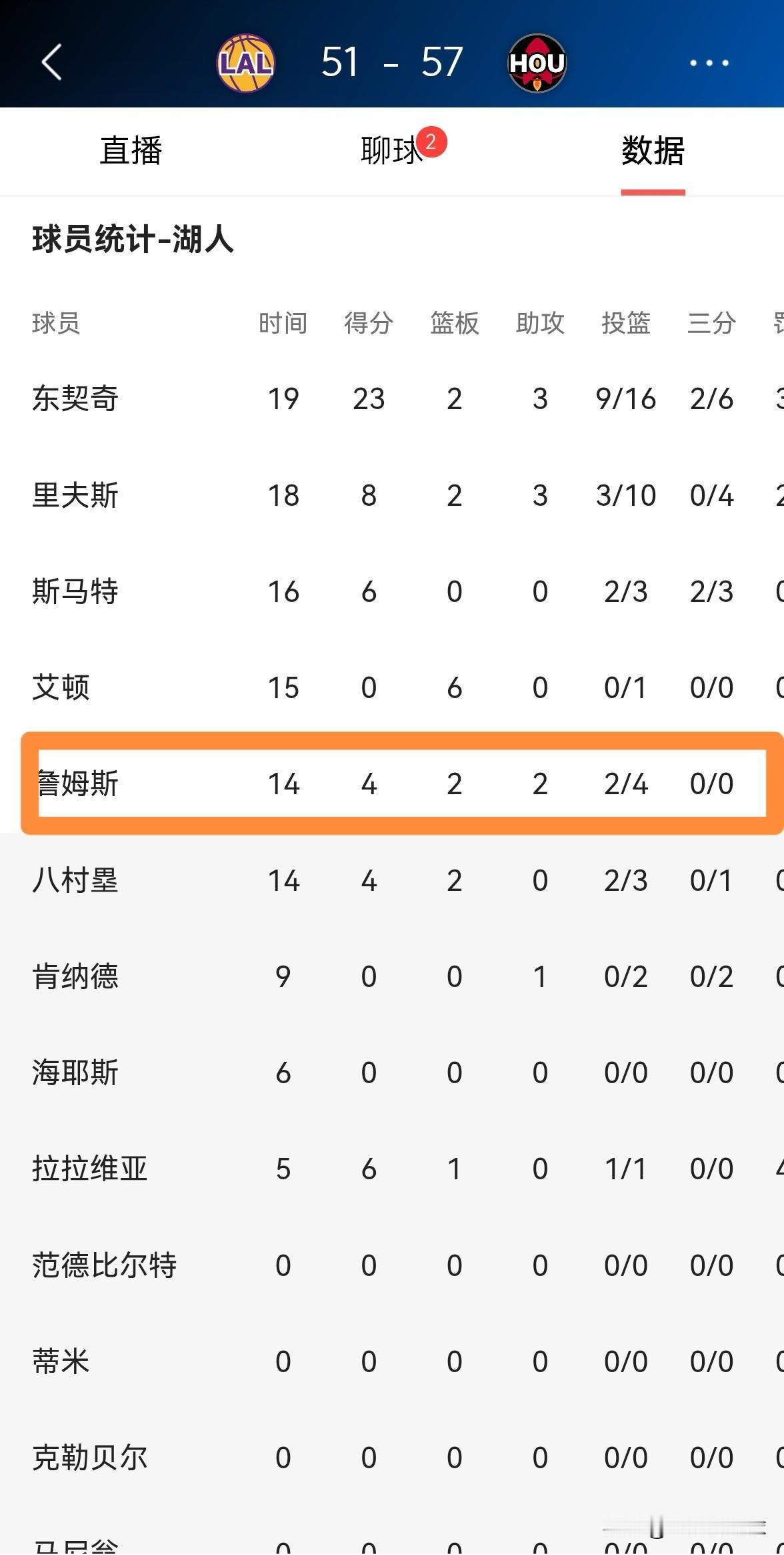 湖人巨星詹姆斯真是特别的暗淡无光!在今天湖人客场挑战火箭的焦点战中,目前双方半场战罢,湖人以51:57处于落后。让人感到极度失望的是,在这场群星璀璨的比赛中,詹姆斯显得特别的暗淡无光。 在前两节比赛中,詹姆斯首发出战14分钟,投篮4中2仅仅得到4分2篮板2助攻,还有1次失误和2次犯规。 毫不夸张的说,和东契奇以及杜兰特的出色表现相比,詹姆斯的表现简直是不值一提,詹姆斯完全成为了东契奇和杜兰特身边的陪衬。
