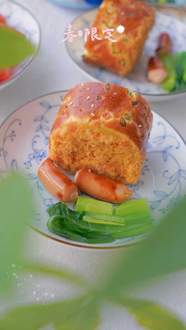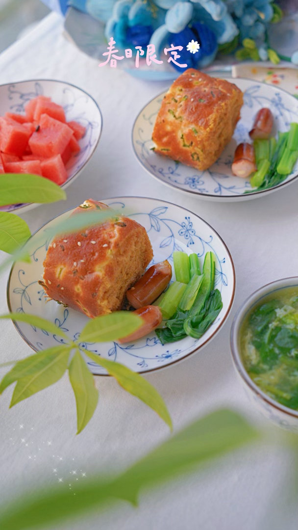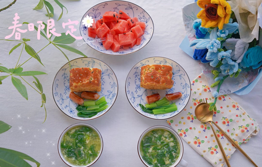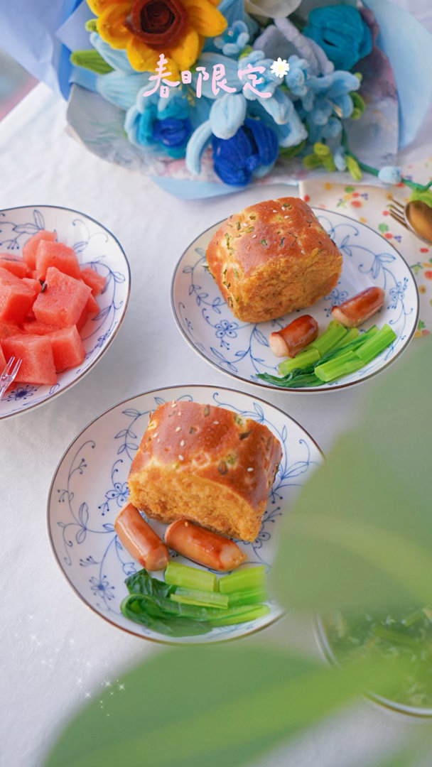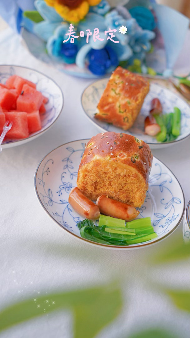 早安早餐🥞 今日份早餐:春天的味道🍃肉松咸面包+脆烤肠+甜西瓜+暖汤,碳水、