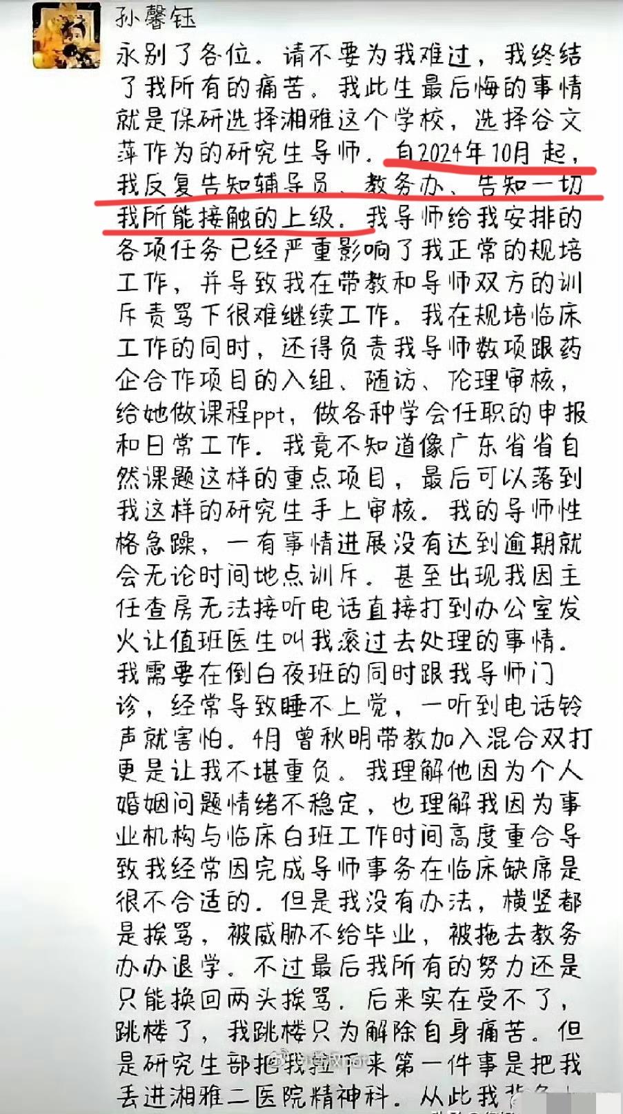 湘雅孙同学事件最让人寒心的, 不是导师对她的压榨,也不是带教老师对她的冷漠, 而是她找遍了自己能接触到的上级,反映她受到的不公平待遇,甚至在已经有一次自杀未遂经历的情况下,没有任何相关人员站出来帮助她。 只有同学、舍友鼓励她。 如果在这个过程中,哪怕是办公室的普通人员重视她的事情,通过行政方法帮帮她,她也不会绝望到自杀。 人怎么可以冷漠到这种地步!