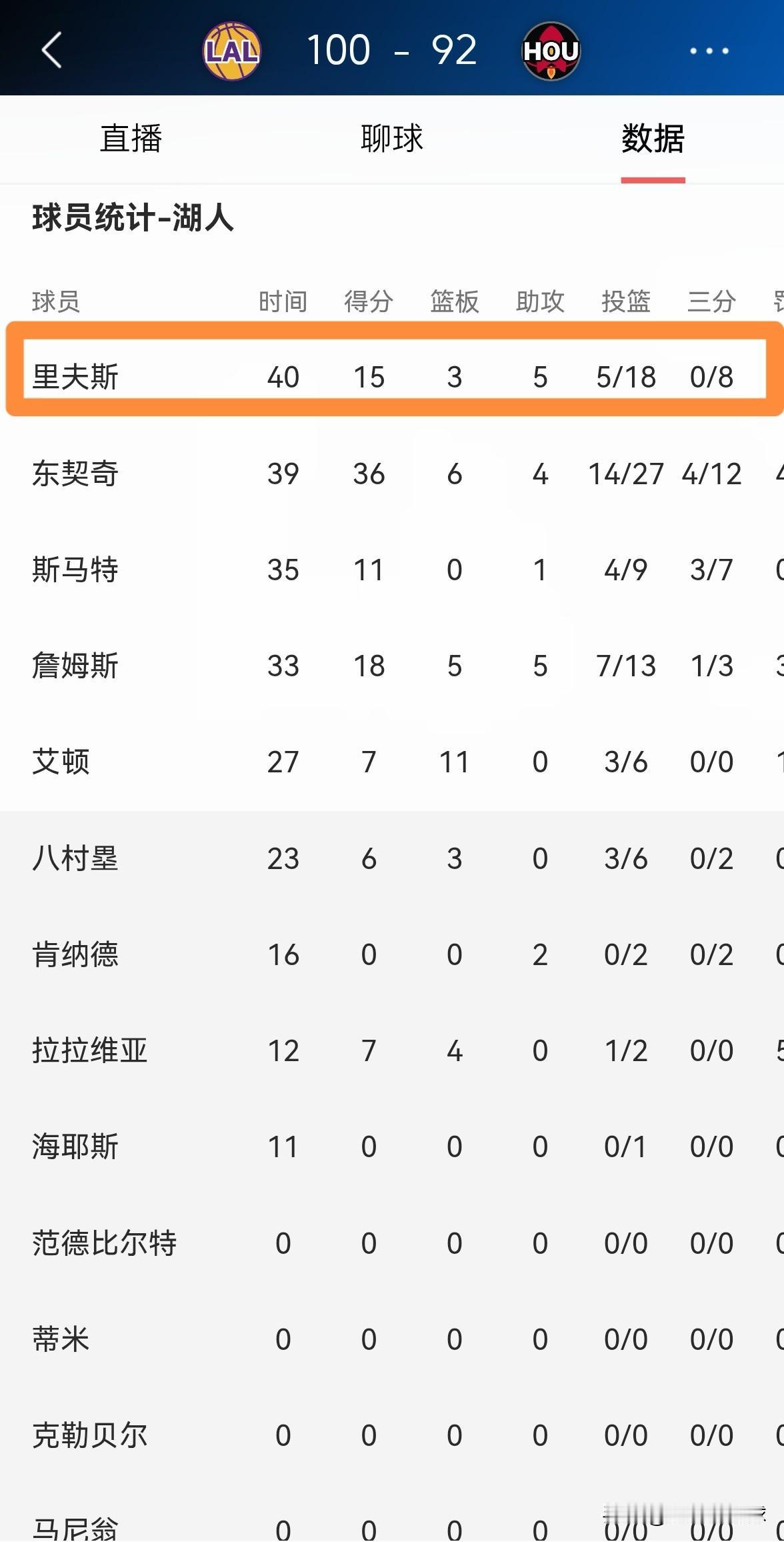湖人超级后卫里弗斯真是大失水准!虽然今天湖人在客场以100:92击败火箭,但是里弗斯的表现却大失水准,特别是在三分球方面,里弗斯更是发挥失常。 全场比赛下来,里弗斯首发出战40分钟,投篮18中5,其中三分球8中0、罚球5中5极其低效的得到15分。 实事求是的说,如果本场比赛湖人输球的话,里弗斯必然要为球队的失利负主要责任,幸运的是,湖人最后赢下了这场强强对话。
