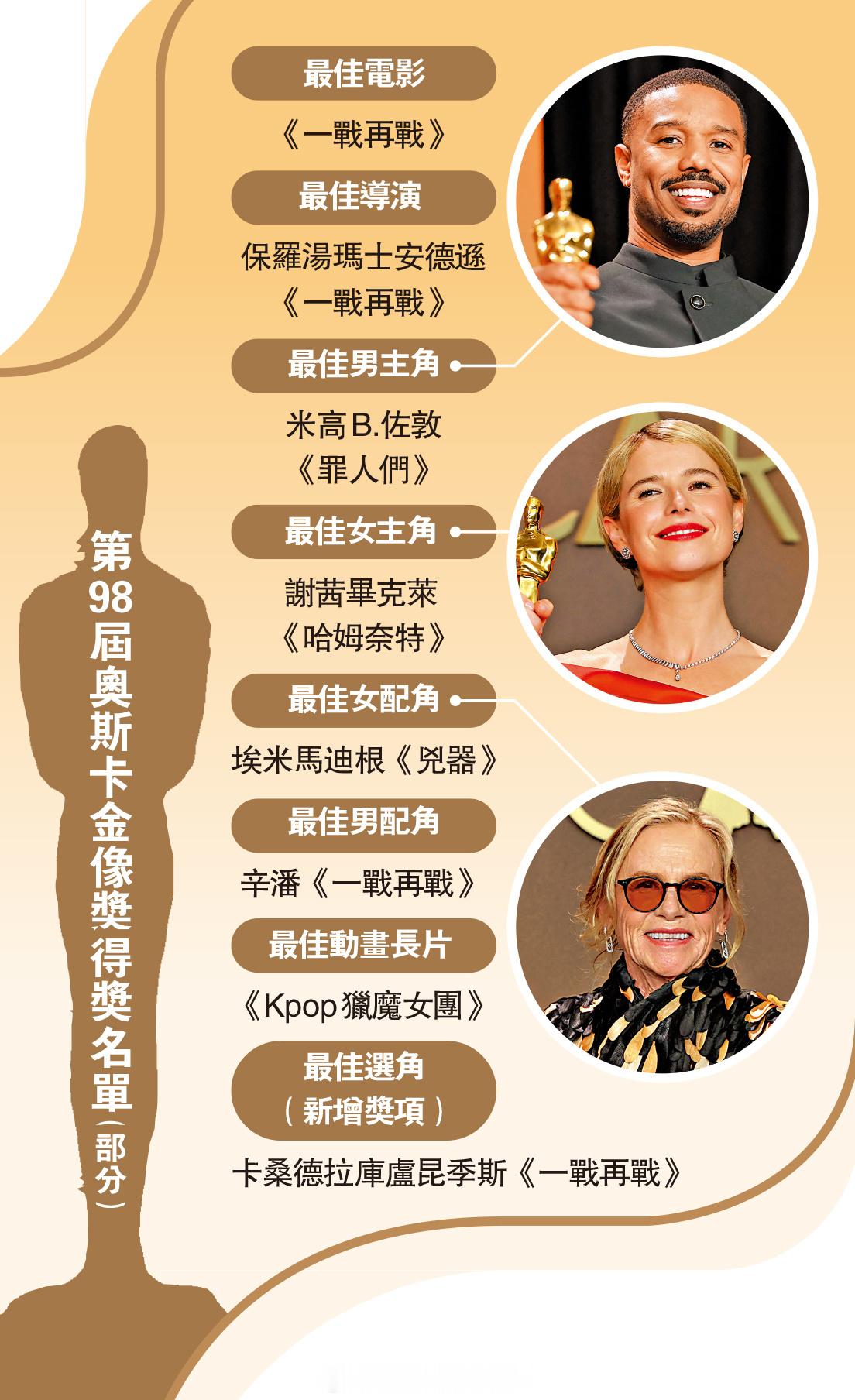 「《一战再战 》攬奥斯卡 6獎成大贏家..頒獎禮現場眾星呼籲「不要戰爭」 … (大公報記者 郭悅盈 劉 毅)第98屆奧斯卡金像獎頒獎禮 於當地時間3月15日在美国 洛杉矶 荷里活 杜比劇院舉行。電影《一戰再戰》成為本屆最大贏家,奪得最佳影片、最佳導演、最佳男配角、最佳改編劇本、最佳選角及最佳剪接共6個獎項。謝茜畢克萊 (Jessie Buckley )憑《哈姆奈特 》再下一城奪得最佳女主角,而《罪人們》男主演米高B佐敦 (Michael B. Jordan )首次摘得奧斯卡最佳男主角。多次入圍的保羅湯瑪士安德遜 (Paul Thomas Anderson )終於如願,憑《一戰再戰》獲得最佳導演。典禮期間,亦有多名得獎者及嘉賓在致辭中提及「不要戰爭」,表達對停止衝突與珍惜和平的期望。本屆典禮共頒發24項大獎,由身兼主持人、編劇、製作人及喜劇演員的康納歐布萊恩連莊 (Conan O'Brien )擔任主持人。今年的這場影藝盛會籠罩在戰雲密布的國際形勢下,其中頒獎嘉賓、主持人等紛紛表達反戰訴求。來自西班牙 的男演員哈維爾巴登 (Javier Bardem )公開批評美國非法對中東開戰,大聲要求立刻停止戰火。米高B佐敦首封「最佳男主角」最佳影片、最佳導演、最佳改編劇本和最佳男配角等六項大獎授予影片《一戰再戰》,而新角度、多類型混搭的《罪人們》也收穫四項大獎。保羅湯瑪士安德遜憑《一戰再戰》首度奪得奧斯卡最佳導演。他在發表感言時表示,能夠成為電影歷史的一部分,自己深感榮幸。談及創作這部作品的初衷,他表示自己是為孩子們寫下這個故事,「也是為我們留給他們的世界道歉」,並希望下一代能為社會帶來更多常識與體面。演員米高B佐敦憑電影《罪人們》奪得「最佳男主角」,為其演藝生涯首次獲得奧斯卡獎項。他在領獎時向多位影壇前輩致敬,表示自己能夠站在這個舞台上,正是因為前人開創的道路..」入內看全文:网页链接 即时娱乐新闻 娱乐圈 电影 ..………. 香港