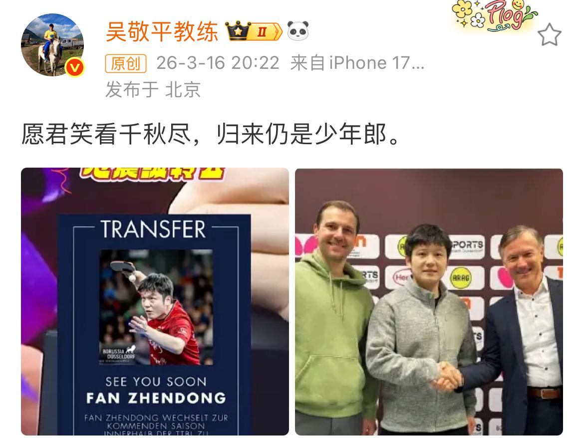樊振东德甲新赛季去留问题终于尘埃落定!2026到2027新赛季“樊振东加盟杜塞尔多夫,球迷期待新赛季表现!” 天下没有不散的筵席,萨尔布吕肯俱乐部作为樊振东征战德甲的首站,给予了他宝贵的机遇和美好的回忆,但作为顶级球员,不会安于现状,总会迈出新的步伐,迎接新的挑战! 时至今日,樊振东俨然成为中国乒坛与欧洲乒坛相互交流的明信片,伟大的运动员,总是在不断地探索别人未曾有过的路,全力以赴将竞技体育推向一个新高度!