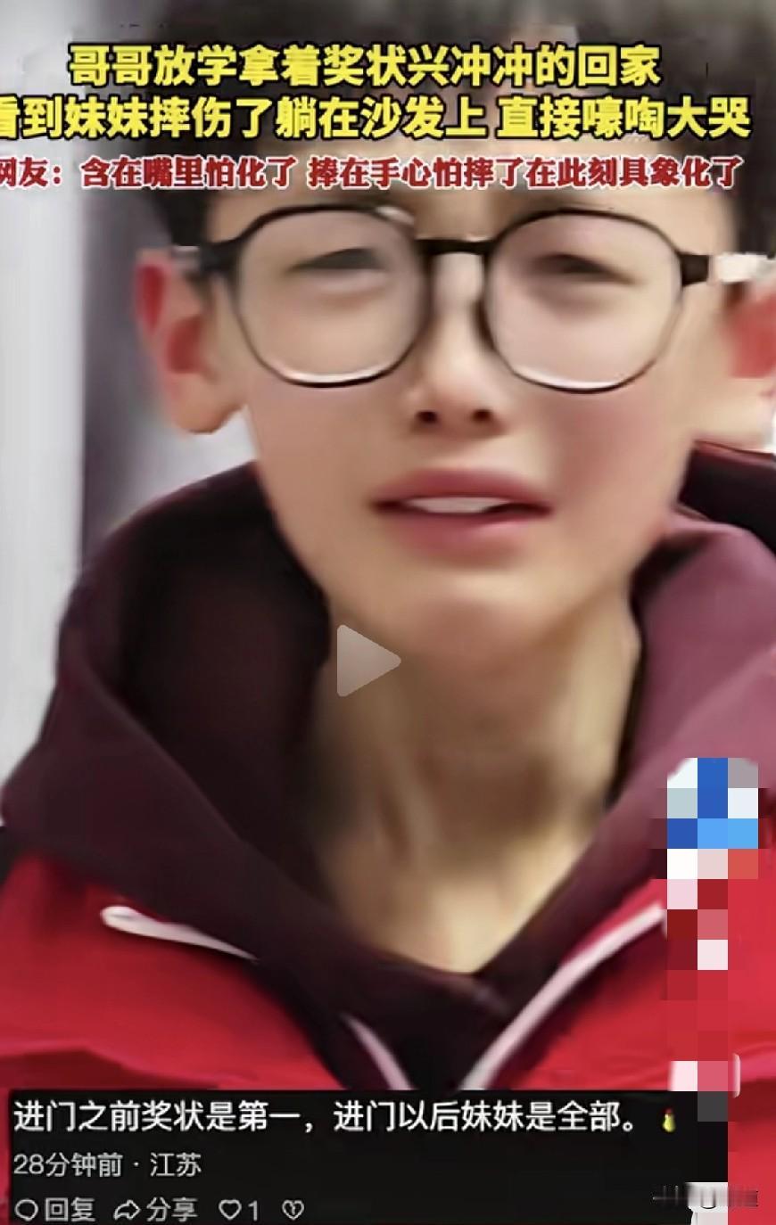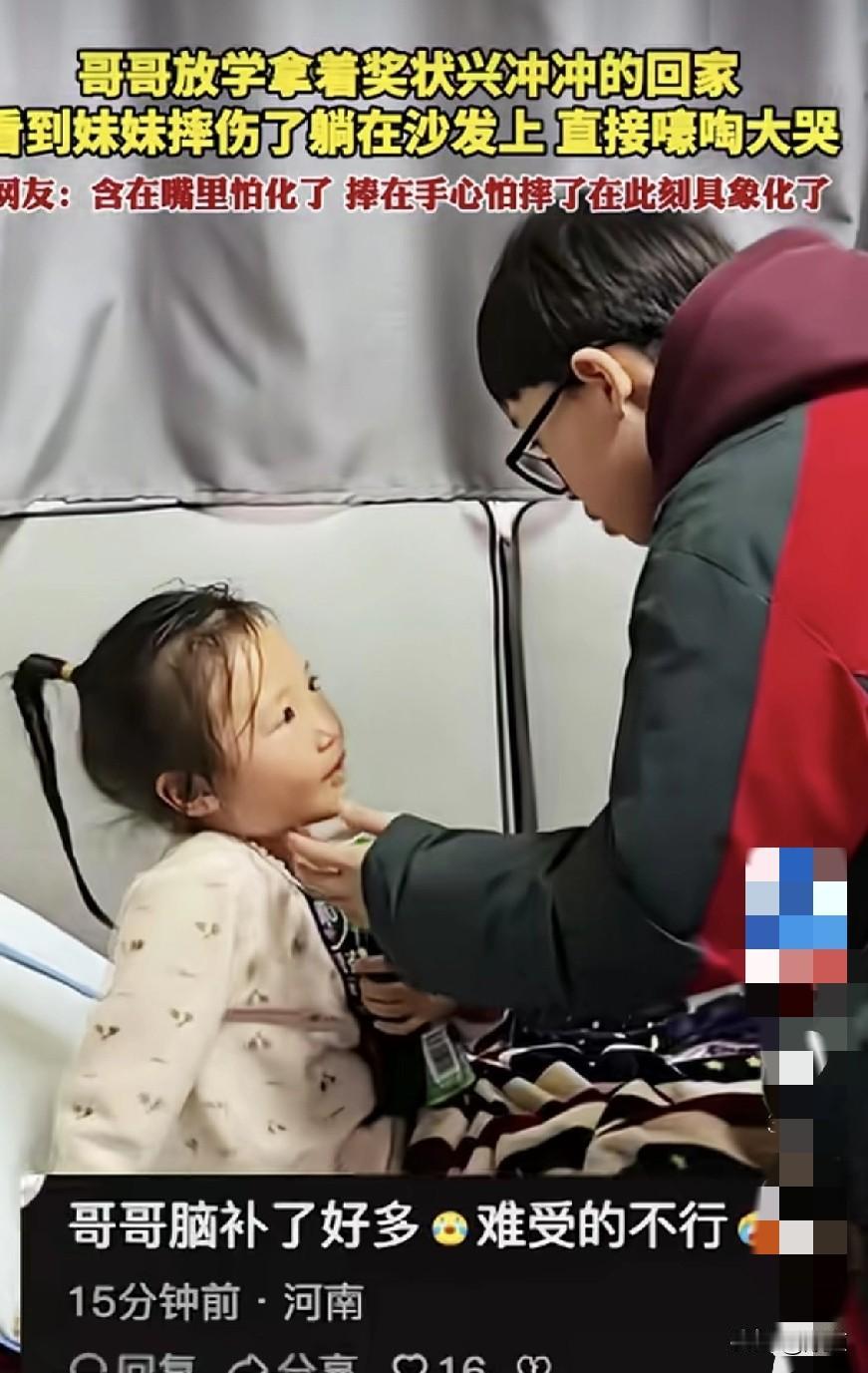 这就是手足之情吧。 哥哥放学回来,手里拿着两张奖状兴冲冲的走了进来。 一扭头看到沙发上受伤的妹妹,奖状一扔奔妹妹就去了。看到妹妹的伤情后,心疼的大哭。转头问妈妈妹妹怎么了? 这样的兄妹之情太让人感动了,而且这个哥哥从小就知道心疼妹妹。 这样的兄妹长大了也会特别亲,这才是给哥哥生了一个亲人。