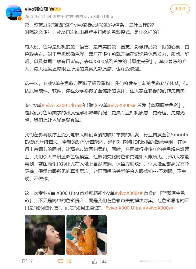 这次vivo搞了个新色彩,主打真实,以前拍照算法太重,照片容易假。这次就是想让你拍出来的东西,颜色、光线、人脸皮肤的质感,都跟你眼睛看到的一模一样,不刺眼,很柔和自然,看着舒服不累,真好~