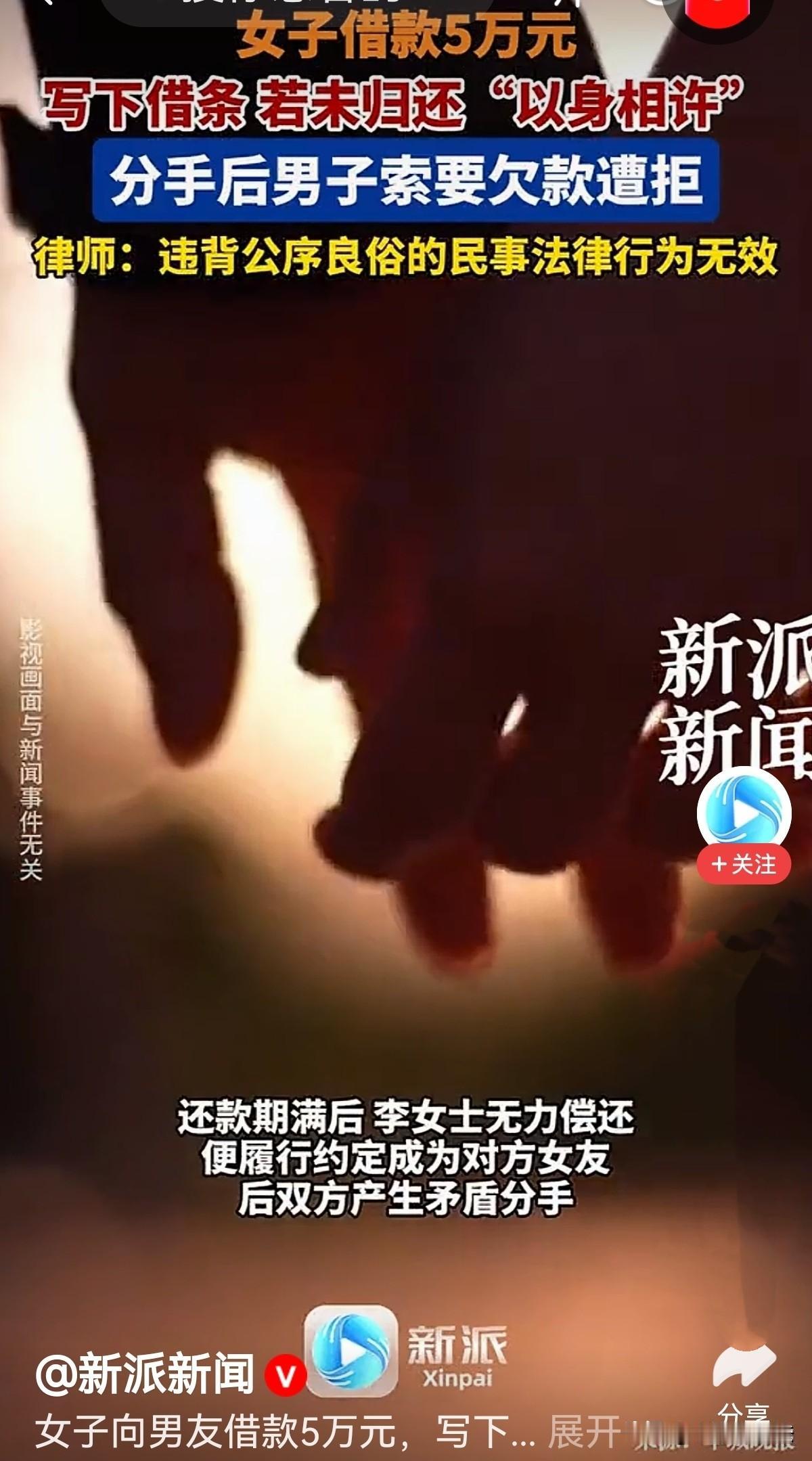 白嫖成功了!女子向男子借了5万元,男子问她要是还不上咋办?女子没犹豫:还不上就以身相许!男子同意。女子约定了还款日期并写了借条。谁知,还款期满,女子真没钱还,只能去做男子女朋友。后两人发生矛盾分手,男子转头就要那5万元欠款。女子怒了:我已履约,钱不还了!你出尔反尔?网友:这男人不讲武德! 生活里总有些让人哭笑不得的奇葩事,感情和钱搅在一起,往往会闹得一地鸡毛。 李女士做生意,手里资金周转不开,房租、日常开销压得她喘不过气,四处借钱又碰了壁,思来想去,她找到了平时关系还不错的朋友张先生。 李先生有钱并早就对李女士有意思,看着她着急的样子,张先生故意装模作样地说:5万块钱可不是小数目,万一你不还,我可咋办? 李女士看张先生有顾虑,她信誓旦旦地让他放心,说自己借钱肯定能按时还上。 李先生仍一脸质疑,没痛快答应。 为了彻底打消张先生的顾虑,也为了能顺利拿到这笔钱解燃眉之急,李女士脑子一热说:如我还不上,就以身相许,就做你女朋友来还债! 这正随他意,张先生立马答应借钱。李女士写了5万元的借条,并注明还款日期,还标注还不上以身相许。 李女士或许是抱着侥幸心理,觉得先拿到钱再说,说以身相许只是搪塞敷衍。 张先生却无比高兴,他想着有这么个约定兜底,钱也不至于打水漂,到时候没钱有人,自己不会亏。 两人就这样一拍即合,张先生把5万元转给了李女士,李女士拿着钱满心都是暂时摆脱困境的轻松,丝毫没意识到这个约定埋着多大的隐患。 很快还款日期到了,李女士傻眼了,她根本无力还款,思来想去,她狠狠心,觉得履行约定,去做张先生的女友,来偿还债务。 张先生自然是欣然同意,两人就这样从朋友变成了情侣,可这段以债务为起点的感情,从一开始就注定了不会长久。 没有真挚的感情基础,只是靠着欠款捆绑在一起,相处中的矛盾越来越多。 李女士心里总觉得憋屈,自己是因为欠钱才被迫恋爱,对张先生没有半分真心;张先生则觉得,李女士是“抵债”才和自己在一起,态度里少了几分尊重,多了些理所当然。 日常的争吵、观念的不合,让这段本就脆弱的恋情迅速消耗殆尽,没过多久,两人就大吵一架,彻底分手,闹得老死不相往来。 分手后,张先生越想越不甘心:自己实实在在拿出了5万块钱,最后恋爱没谈成,钱也没了,这不是吃了大亏吗? 于是他主动联系李女士,想要回当初的5万元借款,可李女士的态度却十分强硬,直接一口回绝:你这人出尔反尔,我履行了约定,欠款两清了! 面对李女士的赖账,张先生懵了,明明是自己借出去的5万元,怎么就成了“肉包子打狗有去无回”?这不成了人财两空? 两人为此争执不休,谁也不肯让步,张先生无奈向律师咨询,想确定自己手里的借条到底有没有用。 《民法典》第153条第2款 :违背公序良俗的民事法律行为无效 。 律师给出回答:李女士和张先生把恋爱、人身关系当作借款的交易标的,本质上是把感情和人身当成了抵债的商品。 完全违背了公共秩序和善良风俗,这样的约定从一开始就是无效的,不受法律保护。 《民法典》第675条:借款人应当按照约定的期限返还借款。 张先生拿出5万元真金白银借给李女士,有借条为证,双方的借款事实清晰、合法有效,并不会因为那个无效的“以身相许”约定,就免除李女士的还款义务。 简单来说,就是“感情归感情,借钱归借钱”,“以身相许”无效,不污染借款本身效力。 李女士不能用恋爱关系抵掉实实在在的债务,李女士想靠分手赖掉5万元借款,在法律上根本站不住脚。 律师表示,不管张李两人曾是什么关系,5万元借条是真实的,李女士必得归还欠款。 有人说,真是赔了夫人又折兵!让人家白嫖了! 有人说,这男人太坏。既然是借5万还不上,人家已“以身相许”了,两人已互不亏欠了,还还什么钱!啥都想要,太贪了! 还有人说,男子要是不追债了,这不就变成变相嫖 娼了吗?要吃牢饭的!他技高一筹! 对此您怎么看?