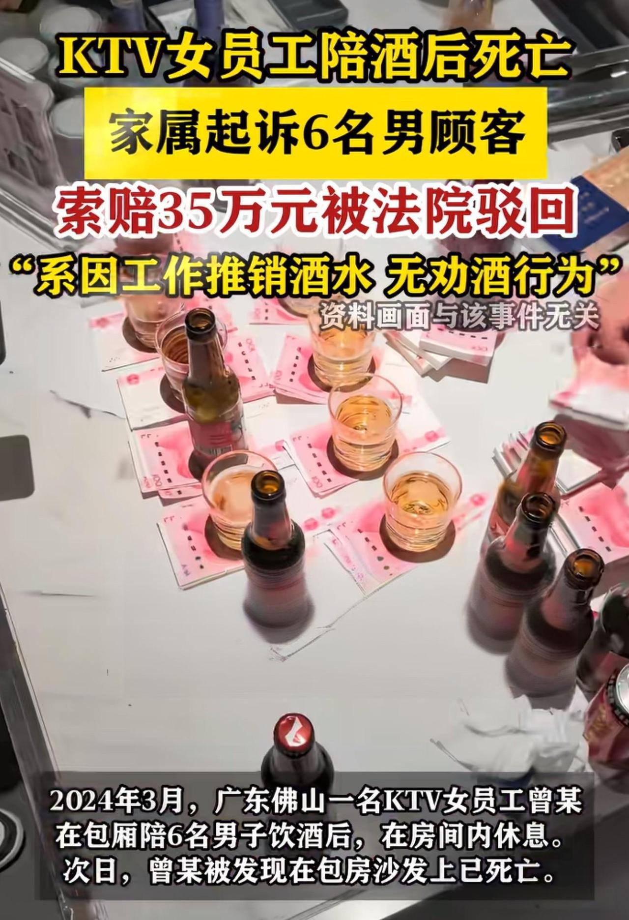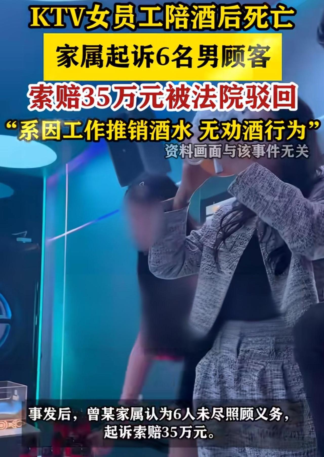 广东佛山,男子和5位男性朋友去KTV放松,期间,一名女子进入包厢,向他们推销酒水,几人委婉拒绝后,女子并未离开,就在一旁坐着,直至酒局散场了,女子仍呆着包房里。 谁知,次日下午,工作人员发现女子时,她已经没了生命体征。事后,家属得知此情况后,认为,男子及其5位朋友对女子有照顾义务,向他们索要35万赔偿。 他们怒怼:是她自己进到包房的,凭什么让我们赔?被拒后,家属将男子及其5位朋友告上法庭。法院这样判了。 法院一审直接驳回了家属的全部诉讼请求,6名男子不用承担任何赔偿责任,也不用付一分钱。 可能有人会问,人都在他们包厢出事了,怎么能一点责任都没有? 其实法院判得一点都不冤,每一条依据都经得起推敲。先把事情的细节补全,这事不是瞎编的,是佛山顺德区法院公开的真实判例,有裁判文书可查。 这名女子是KTV的酒水销售人员,当天主动进到6名男子的包厢推销酒水。6人本来就是朋友小聚,没打算多买酒,就委婉拒绝了她。 按说被拒绝后,正常推销人员都会转身去下一个包厢,可这名女子没走,就安安静静待在包厢角落,不吵不闹,6人也没好意思再赶她。 几人喝酒聊天到凌晨1点左右,酒局散场,结账后就各自离开了。离开前,他们特意看了一眼女子,她当时意识清醒,状态也没什么异常,只是依旧坐在那里。 6人根本没多想,只当她是等下班或者等其他客人,谁也不会料到,这会是他们和这场悲剧的唯一交集。 直到第二天下午5点多,KTV工作人员才发现,这个包厢的门还关着,推门进去后,才看到女子躺在沙发上,已经没了生命体征。 医护人员赶到后,确认女子已经死亡,警方也第一时间介入调查,最终排除了他杀和刑事案件的可能,结合后续调查,确定死因和急性酒精中毒有关。 家属得知消息后,悲痛之下把所有怨气都撒到了6名男子身上。在他们看来,既然女子在6人的包厢里待过,还和他们在同一个空间喝酒,6人就有义务照顾她的安全。 说白了,家属就是觉得“人在你们身边出事,你们就得负责”,张口就索要35万赔偿,说是给女子的丧葬费、精神损失费。 6名男子得知后,又委屈又愤怒。他们反复强调,从来没有邀请过女子,也没有劝过她喝酒,甚至一开始就拒绝了她的推销。 “是她自己赖在包厢不走的,我们又没赶她,也没害她,凭什么让我们赔钱?”这话不是狡辩,确实是当时的真实情况。 双方谈不拢,家属干脆一纸诉状,把6名男子告上了法庭,执意要讨一个“说法”,要求他们连带赔偿35万元。 法院审理期间,调取了KTV的监控、警方的询问笔录,还有相关证人证言,把整个事情的来龙去脉查得明明白白。 法院认为,家属主张6名男子有照顾义务,核心是认为他们是“共同饮酒人”,但实际上,没有任何证据证明6名男子邀请过女子共同饮酒,更没有劝酒、灌酒的行为。 女子是KTV的工作人员,进入包厢是为了推销酒水,属于履行工作职责,并非6人主动邀请的同行人员,双方之间没有形成需要相互照顾的法律关系。 更关键的是,6名男子离开包厢时,女子的身体状态没有任何异常,清洁人员后来在凌晨2点多打扫包厢时,还看到女子在房间里哭泣,这说明当时她还能正常活动,不存在需要紧急救助的情况。 也就是说,6名男子离开时,根本无法预见后续会发生悲剧,他们既没有过错,其行为也和女子的死亡没有直接因果关系。 所以法院最终判决,驳回家属的全部诉讼请求,6名男子不承担任何赔偿责任。可能有人会心疼女子,觉得她为了工作奔波,最后丢了性命,很可怜。 但心疼归心疼,法律讲的是证据和过错,不是“谁弱谁有理”。6名男子只是正常消费,没有任何违法行为,也没有任何过错,不能因为女子在他们包厢出事,就强行让他们承担责任,这对他们来说太不公平。 其实这件事更该反思的是KTV方面。女子是在工作时间、工作场所出事,从凌晨到下午,十几个小时里,KTV工作人员没有及时发现异常,也没有履行相应的救助义务,存在明显的管理漏洞。 说到底,法律的底线就是不冤枉一个好人,也不纵容任何不合理的诉求。这场官司,不仅还了6名男子清白,也给所有人提了个醒:不是所有意外,都能找别人来买单,责任的认定,从来都要看事实和法律。