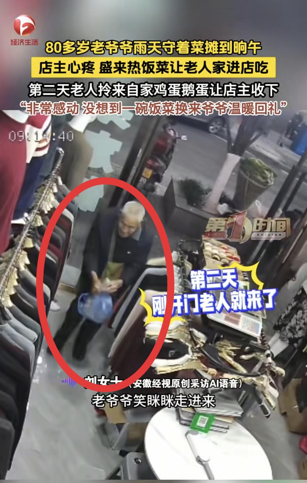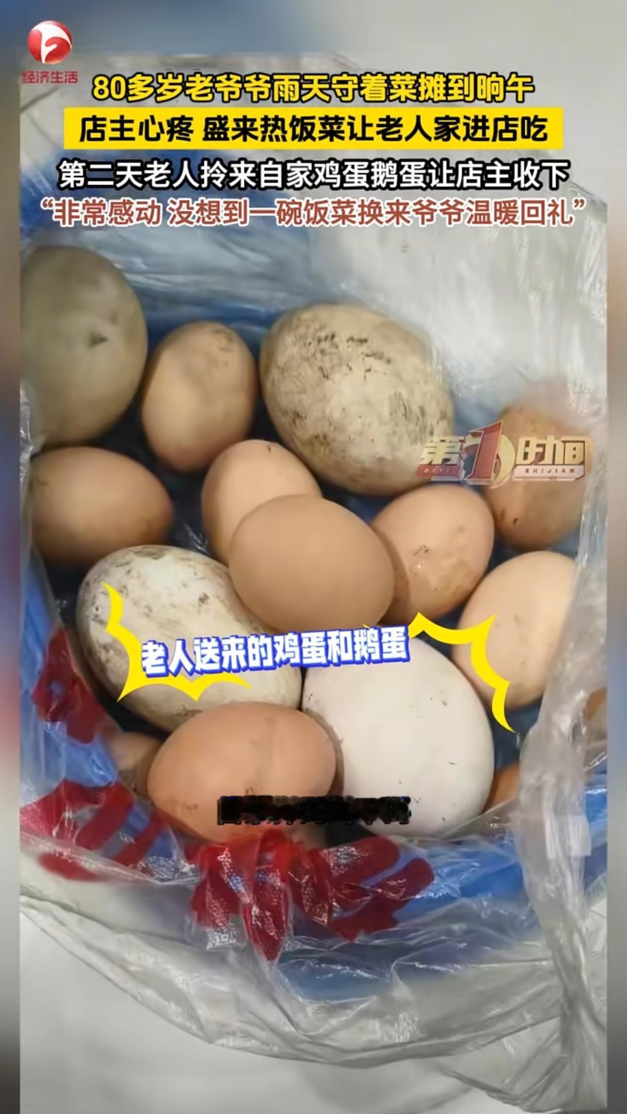 🌙重庆,一位80多岁老人守着小菜摊,从清晨到中午12点多,粒米未进,又冷又饿。旁边的店主于心不忍,给老人盛了一大碗热饭菜:“爷爷,进来吃口热饭吧,别饿坏了”,老人不好意思接受,但架不住店主热忱,只好进店吃了那碗热乎饭菜。之后店主也没把这事放心上,没想到,第二天一大早老爷爷就提着一袋鸡蛋鹅蛋上门了。 事发重庆一处临街的便民菜市,周边都是做小生意的商户,来往的大多是周边居民,平日里烟火气十足,商户之间也多是低头不见抬头见的熟人。 这位80多岁的老人,是菜市的常客,几乎每天都会推着小推车来摆摊,车上摆着自家种的青菜、萝卜、小葱等时令蔬菜,菜品新鲜,价格也实惠,老人话不多,守摊时总是安安静静地坐着,等着路人前来挑选。 事发当天天气阴冷,还飘着零星小雨,体感温度很低,老人天不亮就出了门,推着菜摊赶到菜市,一直守到中午十二点多,期间没离开过摊位一步,也没吃任何东西,只是偶尔搓搓手、跺跺脚取暖。 旁边开店的店主忙着打理生意,间隙抬头看到老人,发现他蜷缩在摊位旁,脸色看着有些憔悴,眼神也透着疲惫,明显是又冷又饿,撑着身子不肯收摊。 店主看在眼里,心里很不是滋味,想着老人年纪这么大,在冷风里饿了一上午,身体肯定扛不住,便停下手里的活,转身回到店里后厨,盛了满满一大碗刚做好的热饭菜,饭菜荤素搭配,还冒着热气,足够老人吃饱。 店主端着饭菜走到老人摊位前,轻声喊老人进店吃饭,老人一开始连连摆手,满脸不好意思,觉得平白无故接受别人的饭菜不合适,执意不肯进店。 店主看出了老人的顾虑,没有强求,只是反复劝说,告诉老人不过是一顿家常便饭,不用放在心上,年纪大了饿久了伤身体,先吃口热的暖暖身子。 老人推脱了好一会儿,实在架不住店主的热忱与好心,拗不过对方,才慢慢起身,收拾好摊位旁的东西,跟着店主进了店,接过那碗热饭菜,小口小口地吃了起来。吃饭的时候,老人话很少,只是偶尔抬头跟店主道谢,神情满是局促与感激。 店主全程没有打扰老人,让老人安安稳稳吃完了整碗饭菜,还贴心给老人倒了杯热水,看着老人吃饱喝足、气色缓和了不少,才放下心来。在店主看来,这只是举手之劳,邻里之间互相帮衬是常事,根本没把这件小事放在心上,吃完饭后便继续忙着打理店铺,压根没想着要老人的任何回报。 老人吃完饭后,再三向店主道谢,才慢慢回到自己的菜摊前,继续守着剩下的蔬菜售卖,直到傍晚卖完菜才收拾东西离开。 周边的商户都知道,老人家境普通,没有稳定的收入来源,平日里就靠摆摊卖自家种的菜换点零花钱,补贴日常开销,生活过得十分节俭,平日里吃饭都是能省则省,很少舍得花钱在外买饭吃。 老人平日里出摊,从来不会缺斤少两,遇到年纪大的顾客,还会主动多给一把青菜,为人实在又厚道,周边商户和老顾客都对老人印象很好。 只是老人性子内敛,不爱麻烦别人,即便自己遇到难处,也很少主动开口求助,这次挨饿守摊,也是想着多卖会儿菜,多挣一点生活费,才硬扛着不肯吃饭。 让店主完全没想到的是,这份随手的善意,竟然换来了老人格外郑重的回馈。第二天一早,店主刚打开店门,就看到老人提着一个布袋子站在店门口,老人看到店主,连忙走上前,把手里的布袋子往店主怀里塞,袋子沉甸甸的,里面装的全是自家养的鸡、鹅下的蛋,有鸡蛋还有个头更大的鹅蛋,个个干净饱满,一看就是老人精心挑选过的。 老人告诉店主,这些蛋都是自己家里攒下的,没有喂过饲料,吃着放心,特意拿来感谢店主昨天的热饭菜,嘴里不停念叨着,不能白吃别人的饭,一定要收下这份心意。 店主见状连忙推辞,说一顿饭不值当这么贵重的回礼,让老人把蛋留着自己吃,或是拿去卖钱,可老人态度十分坚决,放下袋子就转身要走,不肯再收下店主的推脱之词。 店主拦不住老人,只能收下这袋鸡蛋鹅蛋,看着老人慢慢走回菜摊的背影,心里满是感动。店主坦言,自己只是做了一件微不足道的小事,压根没想着要回报,可老人却把这份善意牢牢记在心里,用自己最珍贵的东西来回馈,这份朴实的真心,远比任何贵重物品都更打动人。 这件小事很快在周边商户和居民之间传开,大家都为这份双向的善意动容,有人拍下现场画面分享到网上,也引来不少网友的关注。 没有轰轰烈烈的情节,只是市井之间最平常的暖心瞬间,却藏着最质朴的人情冷暖,一碗热饭暖的是老人的胃,一袋土鸡蛋暖的是店主的心,更是让路过的人都感受到了人间温情。 生活里的善意往往就是这样,不需要惊天动地的举动,一句暖心的问候、一顿热乎的饭菜,就能照亮他人的片刻时光,而这份善意也总会以另一种方式回馈到自己身边。 看完这件事,你有没有遇到过类似的暖心小事?你觉得这种双向奔赴的朴实善意,是不是最打动人心?