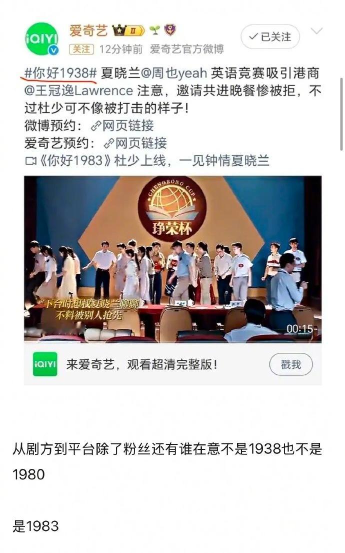 周也、翟潇闻新剧叫《你好1983》,官博和平台连续把剧名写错,这错误也太低级了吧~