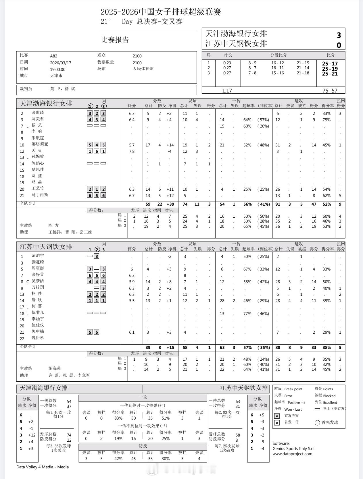 【技术统计】排超联赛半决赛第一回合,天津女排3比0江苏女排(25-17 25-19 25-21),天津女排全队进攻成功率高达52%