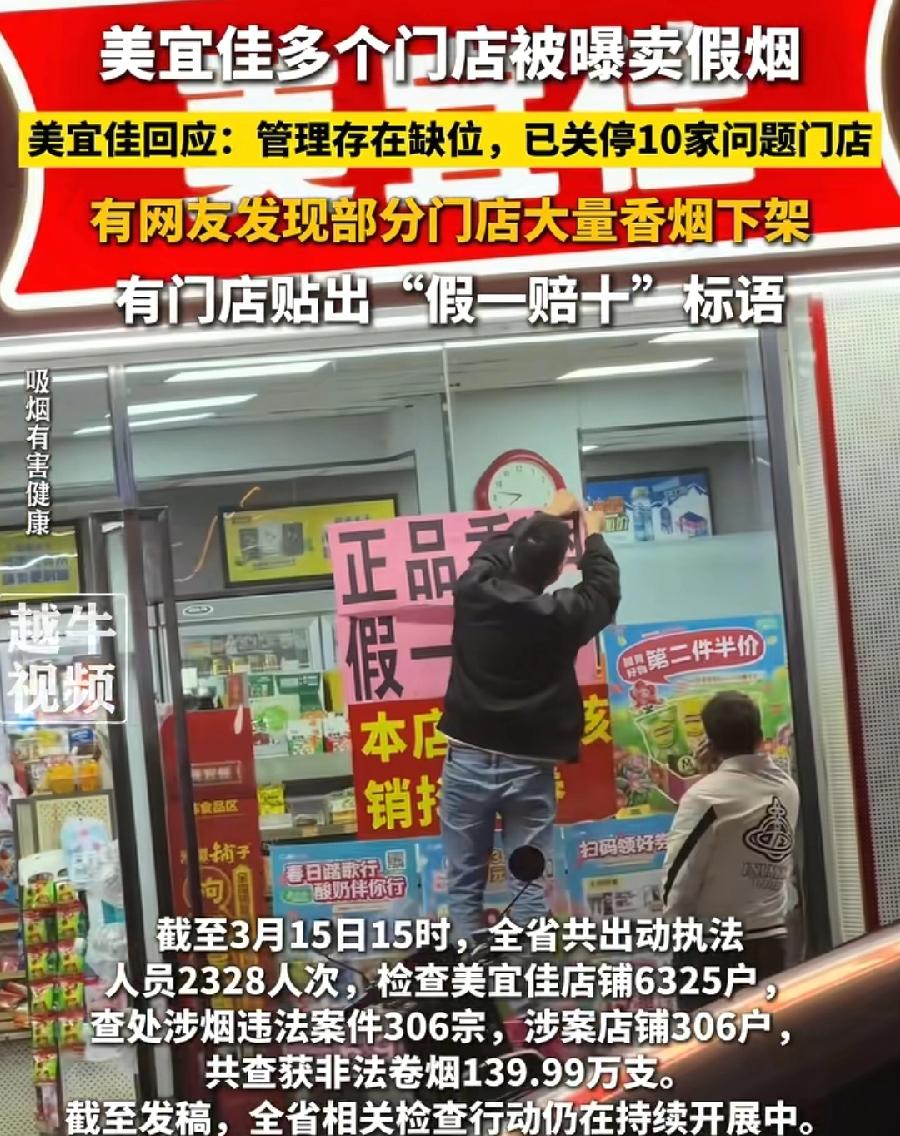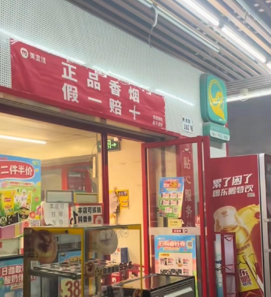 美宜佳部分门店,张贴承诺标语,正品香烟、假一罚十,其实也不能一棍子打死,美宜佳加盟店也是个体商户,挂了美宜佳的牌子,可是香烟都是点休息自己进货,总部不管也付出了代价,砸了招牌!要解决美宜佳门店卖假烟,只有一个方法,烟草局平时抽查!顾客买到假烟举报!平时就罚!