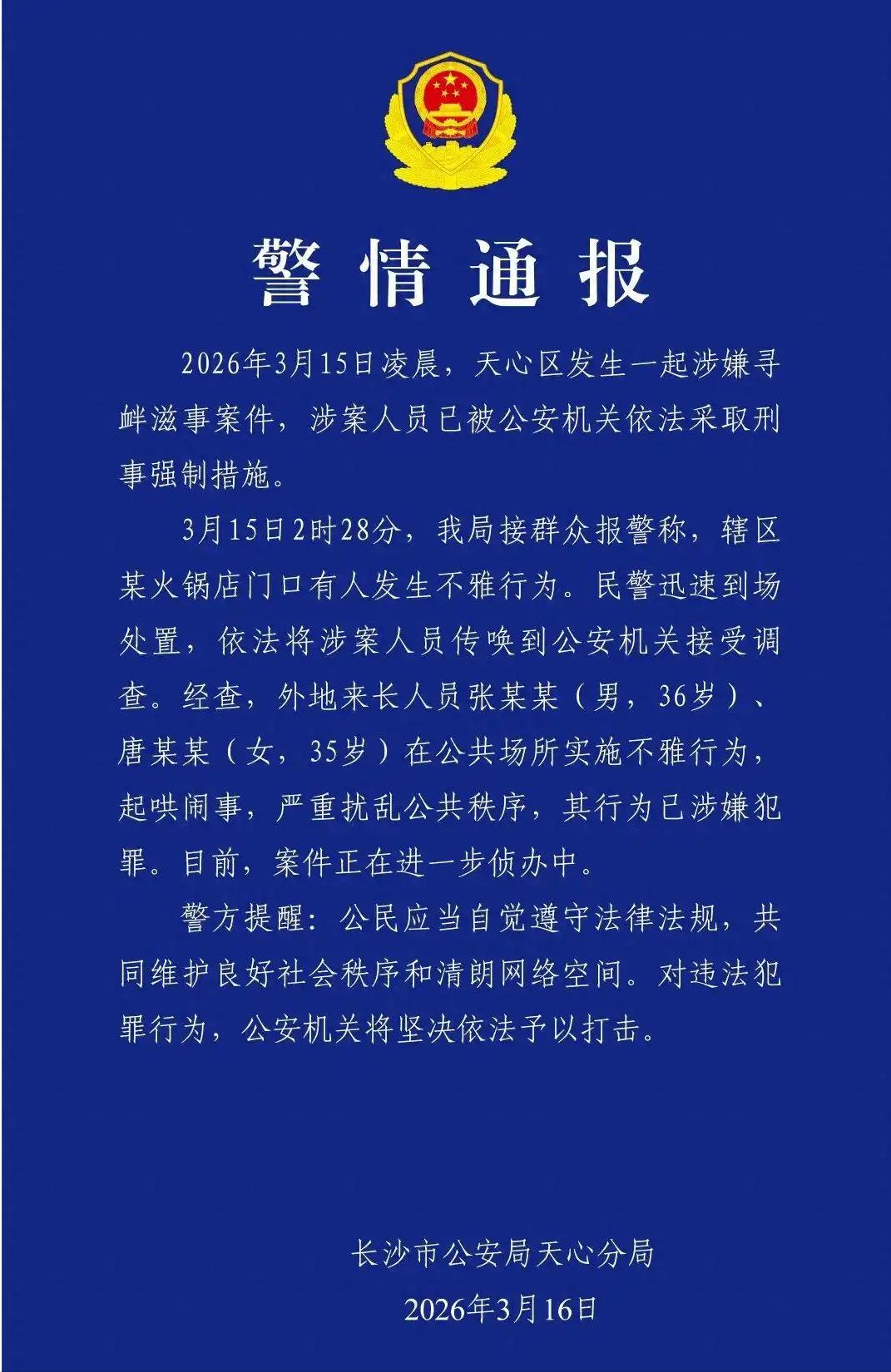 真是林子大了,什么鸟都有! 湖南长沙,一对男女,凌晨时分在一家火锅店门口,做着不堪入目的动作。 周围的人都被这一操作整懵了,有人拿出手机拍视频,两人见有人拍竟然还摆起了姿势,有人看不下去直接报了警,没一会帽子叔叔赶到对两人采取强制措施。 网友:丢人丢到姥姥家,门口的火锅店都让他们熏臭了! 网友这话一点不夸张,这俩人的操作是真的突破底线,没一点公序良俗的概念。 事发时间是3月15号凌晨2点多,那会儿长沙解放西路周边还挺热闹,火锅店没打烊,还有不少路人往来。这俩人就在火锅店门口的公共区域,公然做不雅动作,完全不管周围有没有人。 周围路人一开始都看懵了,没人敢相信自己的眼睛。有路人出于好奇,掏出手机拍视频,没想到这俩人不仅不收敛,还故意摆起姿势配合拍摄,丝毫没有羞耻感。 总有明事理的人,有位路过的市民实在看不下去,直接拨打了110报警。警方接到报警后反应很快,没几分钟就赶到了现场,当场就对双方采取了强制措施,把俩人传唤回去接受调查。 很多人可能觉得,俩人就是行为不雅,顶多批评教育或者拘留几天。实则不然,警方调查后认定,他们的行为已经涉嫌寻衅滋事罪,不是简单的治安违法。 法律上有明确规定,在公共场所起哄闹事,造成公共场所秩序严重混乱的,就构成寻衅滋事罪,要承担刑事责任。这俩人的不雅行为,引来了大量路人围观,不仅堵塞了人行道,还影响了周边商户的正常经营,已经造成了公共秩序的严重混乱。 俩人之所以敢这么肆无忌惮,核心就是法律意识淡薄,还可能抱着博眼球、赚流量的心思。现在很多人被流量冲昏头脑,觉得只要能出名,不管是美名还是恶名都行,却忘了公共场所不是私人领地,不能随心所欲。 他们俩的荒唐行为,不仅丢了自己的人,还连累了所在的城市。长沙是出了名的烟火气城市,解放西路更是网红打卡地,不少外地游客都会去那边。这事传开后,不少网友对长沙的印象都受了影响,这俩人真是得不偿失。 还有现场拍视频、起哄的路人,虽然没有直接违法,但这种看热闹不嫌事大的心态,其实是在助长俩人的嚣张气焰。要是没人围观、没人拍摄,俩人可能早就收敛了,也不会造成那么坏的影响。 更要提醒一句,传播这类不雅视频也可能违法。不少网友把拍到的视频发到网上,导致视频大范围扩散,不仅侵犯了当事人的隐私,还会给社会带来不良影响,严重的还会被追究责任。 警方后续也启动了专项整治,聚焦解放西路、五一广场这些网红商圈,严查街头低俗表演、户外低俗直播这些行为。这也给所有人提了个醒,公共秩序需要每个人共同维护,不管是谁,都不能突破法律和道德的底线。 两人现在肯定特别后悔,但后悔没用。成年人就得为自己的行为负责,法律不会因为“喝多了”“一时糊涂”就网开一面。他们的案例,也给所有抱着侥幸心理、想靠低俗博眼球的人,上了生动又深刻的一课。