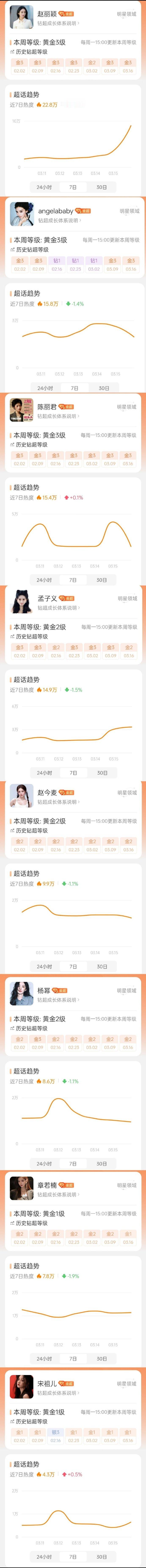 女明星钻超和金超近7日热度统计