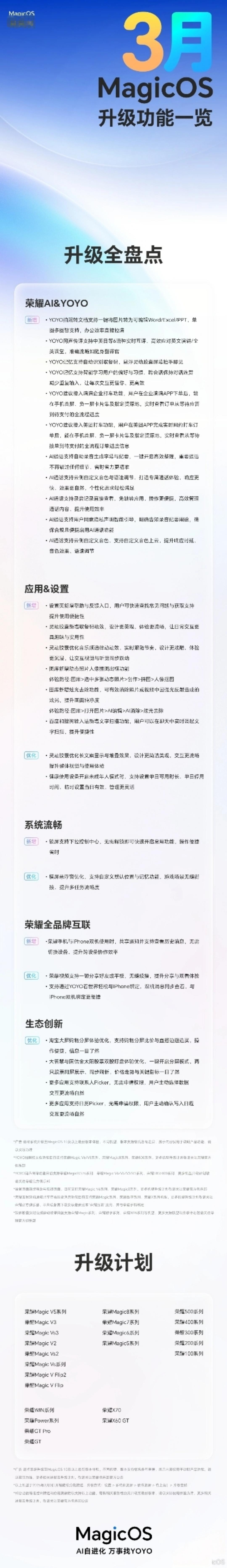 荣耀这次系统更新直接拿捏用户需求,体验感爆棚!MagicOS三月升级干货满满。好的系统就是把细节做到极致。YOYO新增拍照转文档、六语种同声传译,AI通话还能自动生成纪要,办公效率直接翻倍。和iPhone双机通知共享太香了,历史消息一键回溯不遗漏。锁屏下拉控制中心、灵动胶囊音乐律动,每一个功能都踩在实用点上,多款机型已陆续推送,荣耀用户抓紧时间更!