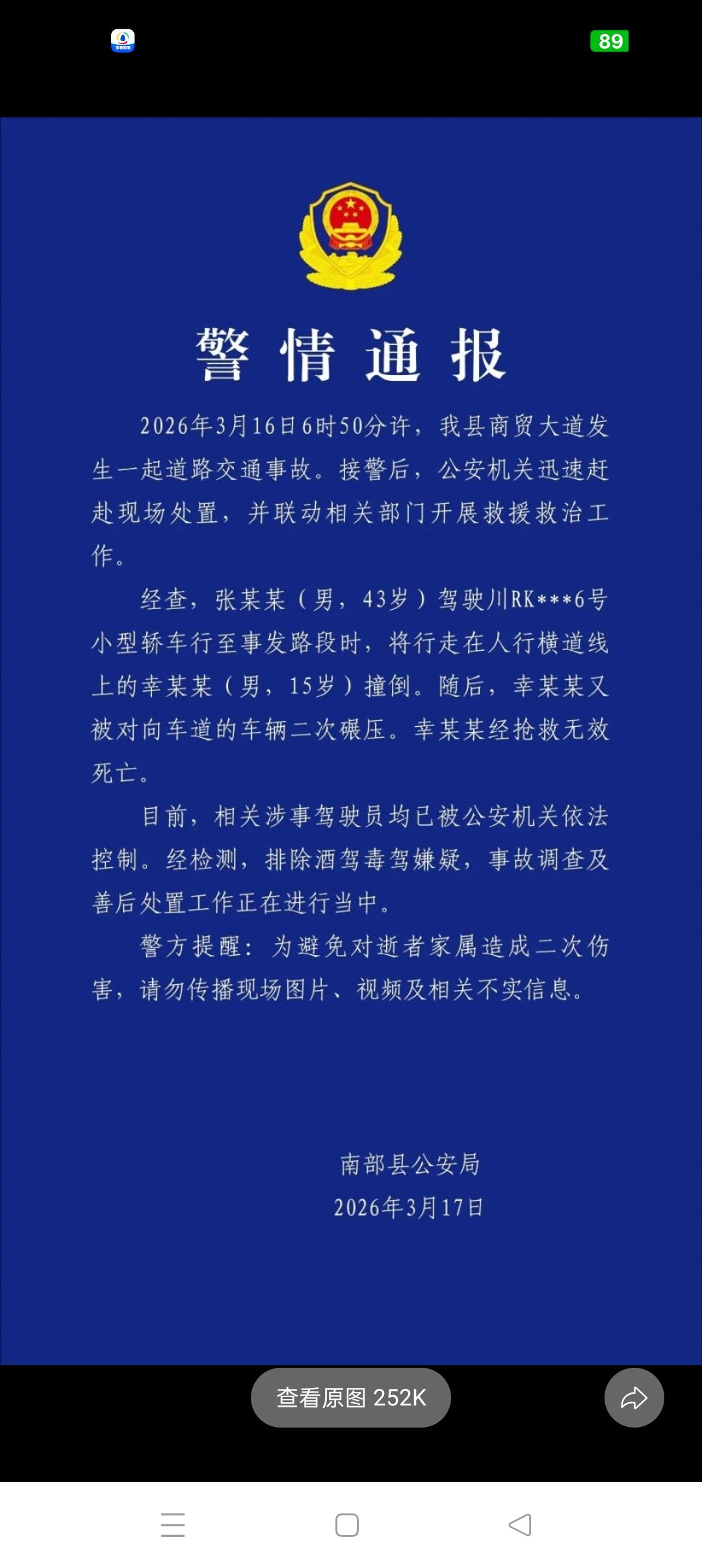 15岁高中生斑马线上被撞身亡,我们还要用多少生命才能换来司机的一脚刹车? 四川南充,3月16日清晨,一名高一学生走在斑马线上,被一辆紧贴中心线行驶、丝毫没有减速的车辆撞飞,随后遭到二次碾压。 母亲踉跄赶到,哭声撕心裂肺。可孩子再也听不到了。 我就想问:斑马线前减速、停车、让行,这几个动作,真的那么难吗? 《道路交通安全法》第四十七条写得明明白白:机动车行经人行横道,必须减速;遇行人通过,必须停车让行。 这不是选择题,这是法定义务!可在太多司机眼里,这条"生命线"早成了摆设,一脚油门抢过去,抢掉的是一个家庭的全部希望。 有人找借口:天色太暗、远光灯刺眼、A柱盲区。可这些哪个是"不减速"的理由?盲区你更应该慢!天黑你更应该看清! 所有借口背后,只有一个真相:司机根本没把斑马线当回事。 看看安徽黄山的做法:人家开展"护航斑马线"行动,新增抓拍设备、优化路口设施、严查不礼让行为,结果呢?涉及斑马线的事故直接下降了38.8%! 这证明什么?证明斑马线事故完全可以防得住!不是天灾,是人祸。不是没办法,是没下决心。 一个15岁的孩子,早上出门去上学,走在斑马线上,以为自己走在安全的地方,但是他再也回不来了。 而他的母亲,余生可能都要活在"如果那天没让他上学"的噩梦里。 我们还要用多少条鲜活的生命,才能换来某些司机斑马线前的一脚刹车? 别再说什么"以后注意"。请现在就注意!你握着的不是方向盘,是别人的命,是你自己的良知。 愿天堂的斑马线,没有飞驰而过的车。愿这人间,别再让母亲听见那种撕心裂肺的噩耗。