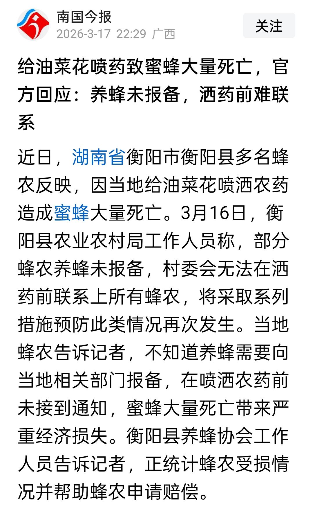 好家伙!一边是油菜花开,春意盎然;另一边却是大量的蜜蜂死去,蜂农欲哭无泪。 湖南衡阳县的蜂农们怎么也想不到,自己辛苦养殖的蜜蜂,虽然熬过了寒冬,却倒在了油菜花盛开的春天里。 这起悲剧原因让人愤怒又无奈,当地为了给油菜花喷洒农药,导致大量蜜蜂被毒死。 面对蜂农的损失,3月16日,当地相关部门工作人员的回应是:部分蜂农养蜂没报备,所以洒药前联系不上。 这话听着没毛病,但细想一下,脊背发凉。联系不上,就可以不联系了吗?没报备,难道蜜蜂就分得清哪块田打了药、哪块田没打? 最讽刺的是什么?是蜂农根本不知道养蜂还需要“报备”。在大多数人眼里,养蜂和种地一样,是祖祖辈辈传下来的营生。你让他们去报备,那谁来通知他们“打药需要提前告知”? 现在事情闹大了,协会开始统计损失、帮忙申请赔偿。但赔偿能赔回那一箱箱的蜜蜂吗?能赔回错过一个花期就耽误一年的收成吗? 说到底,这不是天灾,是人祸。是基层治理中“只管通知到村委会,不管有没有通知到人”的形式主义;是农业生产中“只管庄稼治虫,不管授粉蜜蜂”的短视行为。 希望这次教训能刺痛某些人:农业是个生态系统,打药不是泼水,蜜蜂也不是可有可无的昆虫。没有蜜蜂授粉,你那油菜籽从哪儿来?香甜的蜂蜜从哪儿来? 下一次打药前,能不能多走一步,多通知一声?别让农民与蜂农,成了彼此的受害者。
