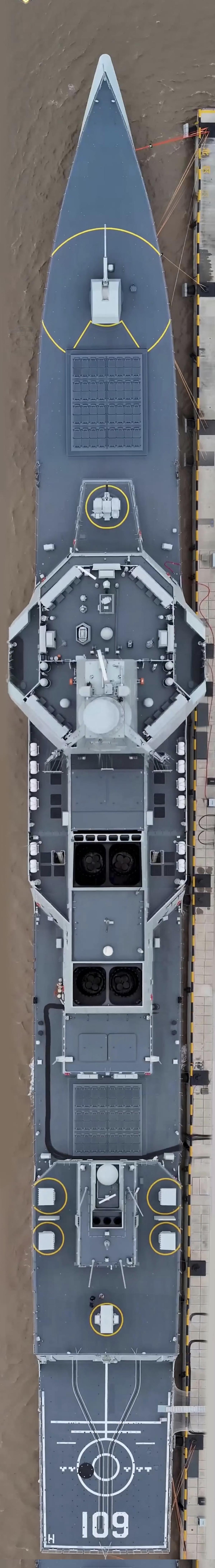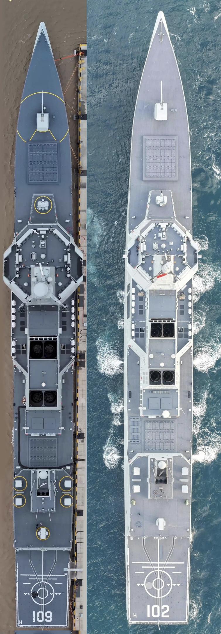 两艘055俯瞰视角对比!来看看有什么区别 109号东莞舰 102号拉萨舰 109号的舷窗数量从第一批次的15扇减少到了11扇。取消了主炮的爬梯,更加自动化。 动力系统升级,雷达电子系统更先进,装载了更强大的各种导弹。