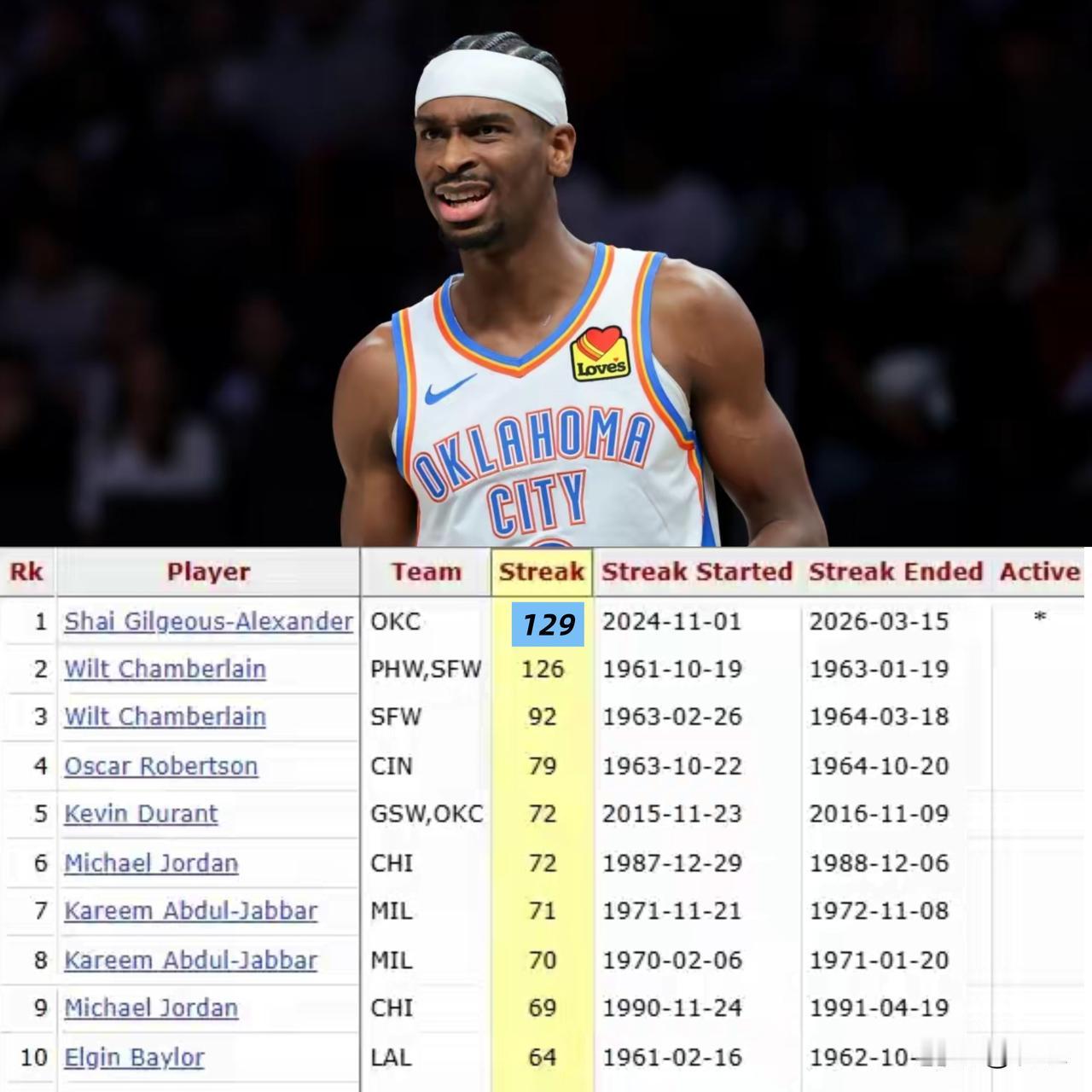 亚历山大这个纪录恐怕也会成为NBA历史上最难破的纪录之一了 3月18日,雷霆对阵魔术,亚历山大拿到40分,这样他连续得分20+的场次来到了129场,继续领跑连续20+场次排行榜。 要知道,亚历山大正值当打之年,并且是球队的绝对核心,拥有无限出手权,每场得分20+如同砍瓜切菜般简单。 再横向对比一下,强如杜兰特这个连续20+场次也不过只有72场,乔丹72场,哈登57场!