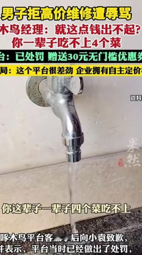 江苏徐州,一男子家厨房水龙头漏水,他买了零件,在啄木鸟小程序预约上门安装服务,师傅上门报价250,给男子优惠到220,男子觉得贵拒绝了,可万万没想到,师傅离开2分钟,又折返回来,要求男子接听他经理电话,经理呵斥男子:你没钱点什么上门维修?这点钱出不起?你一辈子吃不上4个菜!   最近徐州有个大哥,遇上了一件挺窝火的事,本来只是想修个厨房水龙头,结果没修成,还被人劈头盖脸骂了一顿,换谁心里都得不舒服。   据了解,这位大哥姓袁,咱们就叫他小袁吧,那天他家厨房的水龙头突然漏水,弄得满地都是水,挺不方便的,小袁也不想麻烦别人,就自己提前买好了维修零件,然后在啄木鸟小程序上预约了上门安装服务,想着师傅上门帮忙装一下。   没一会儿,维修师傅就上门了,师傅看了看水龙头和小袁买的零件,张口就报了250块钱,小袁一听就愣了,自己零件都买好了,就只是装一下,怎么要这么贵?他跟师傅商量能不能便宜点,师傅琢磨了一下,说给优惠到220块。   可即便这样,小袁还是觉得不划算,毕竟就一个简单的安装活,市面上差不多百八十块就能搞定,220块实在超出了预期,于是就跟师傅说不用修了,让师傅回去。   本以为这事就这么过去了,可万万没想到,师傅离开还不到两分钟,又折返了回来,他手里拿着手机,直接递给小袁,语气挺强硬地让小袁接听电话,说电话那头是他经理。   小袁一头雾水地接起电话,还没等他开口,电话里就传来了经理严厉的呵斥声,字字刺耳:“你没钱点什么上门维修?这点钱都出不起?你一辈子吃不上4个菜!”   小袁当时就懵了,紧接着就是一肚子火,自己只是合理拒绝了过高的报价,既没刁难师傅,也没说什么难听的话,怎么就被人这么侮辱?   其实这事说起来,真不是小袁的问题,说白了,上门维修报价高,顶多是商家贪心,但经理的做法就太过分了,交易没成,就算有不满,也不能人身攻击、侮辱消费者。   而且了解到,这个平台之前就因为乱收费小病大修等问题被曝光过,还承诺过全面整改,可现在看来,整改也只是流于表面。   我琢磨着,师傅之所以折返让小袁接电话,大概率是因为没做成这单生意,回去被经理批评了,才不得不回来找小袁,而那个经理,估计也是觉得自己平台“店大欺客”,觉得消费者拒绝报价就是没钱,才口出恶言。   可他们忘了,消费者愿意选择平台,是出于信任,这样的服务态度和辱骂行为,只会把消费者越推越远,现在很多人找上门维修,都怕遇到“维修刺客”,报价虚高不说,服务还不到位。   小袁的遭遇,其实也是很多消费者的缩影,希望这样的平台能真正重视问题,别再只做表面整改,好好规范报价和服务,尊重每一位消费者,不然再这样下去,迟早会被市场淘汰。