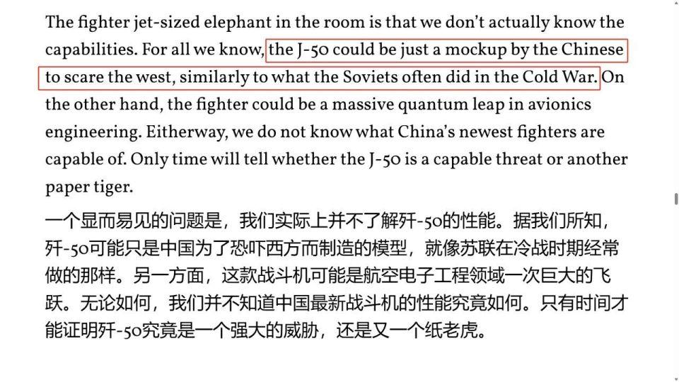 “帝国主义都是纸老虎”。 当1946年伟人这样评价美国时,那时候他们的力量全世界遥遥领先,更是彼时的中国所不能相比的。没想到的是短短的80年过去了,他们的一个权威军事媒体如此评价我们的最新六代机:“中国的歼-50隐形战斗机可能是一只飞行的纸老虎。”,更是酸溜溜地说出了“据我们所知,歼﹣50可能只是中国为了恐吓西方而制造的模型”。 美国人或许从来都没想过对于最先进战斗机研发的路上,会有一天输给了中国。当我们的样机在试飞时,他们的F-47依然只是PPT文件。 更让他们破防的是,哪怕我们已经一而再再而三的上天试飞了,并且是样机迅速迭代,他们依然觉得这是模型机,是纸老虎。 其实我们也很乐见这样的局面:当《1945》的忠实读者,美国军工领域的专家,美军及政府的高级官员都相信这只是模型机,是纸老虎。那到时候当这只“纸老虎”亮出利爪的时候,他们那种震撼、惊骇、无助会是多么的精彩。毕竟就目前网上流传出来的歼-50具备了全向隐身+超远程火力+有人/无人协同,其与五代机存在较大的代差,完全不是五代机可以比拟的。 但话说回来,他们会相信《1945》这纸老虎的言论吗?