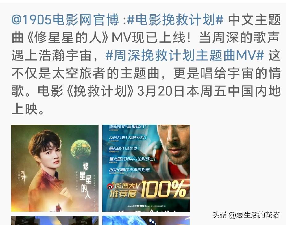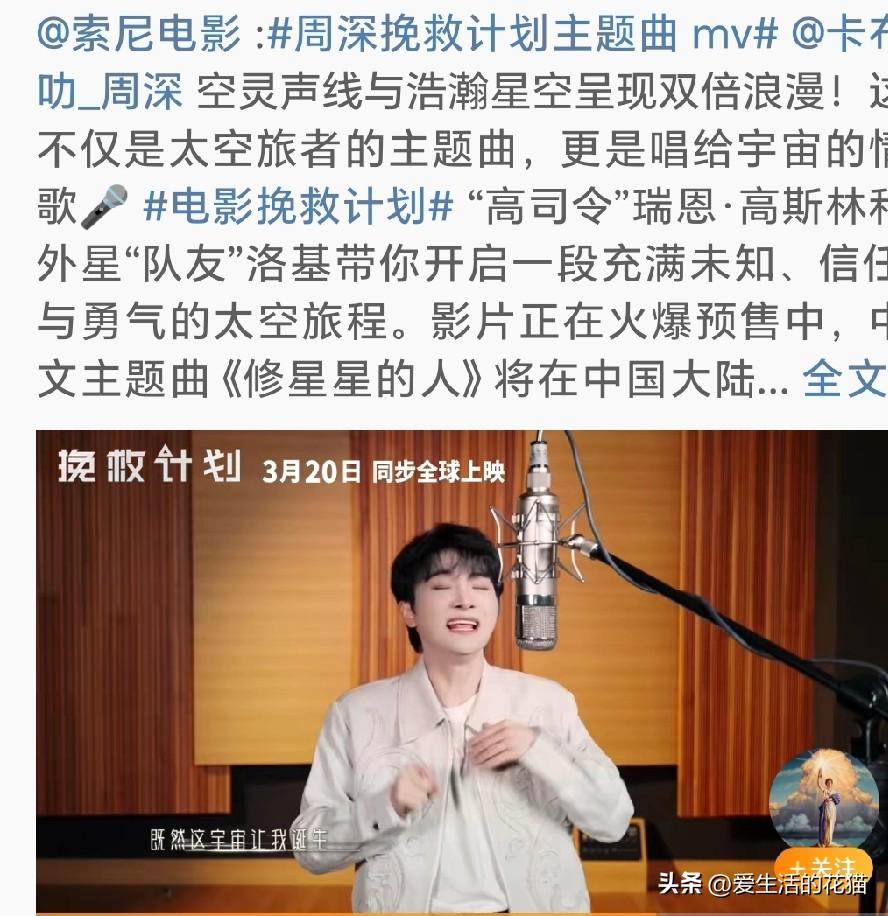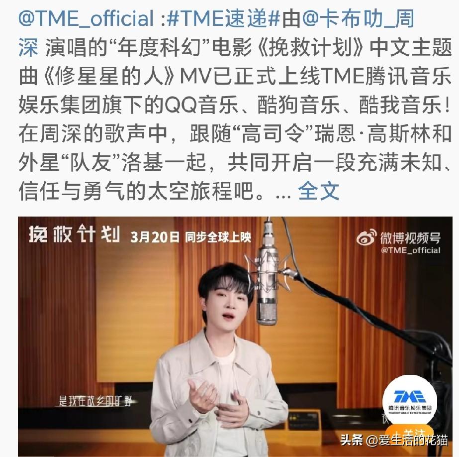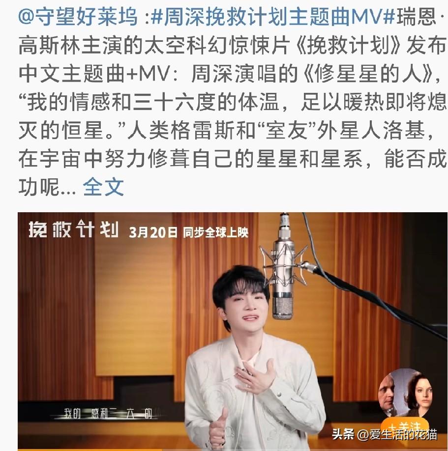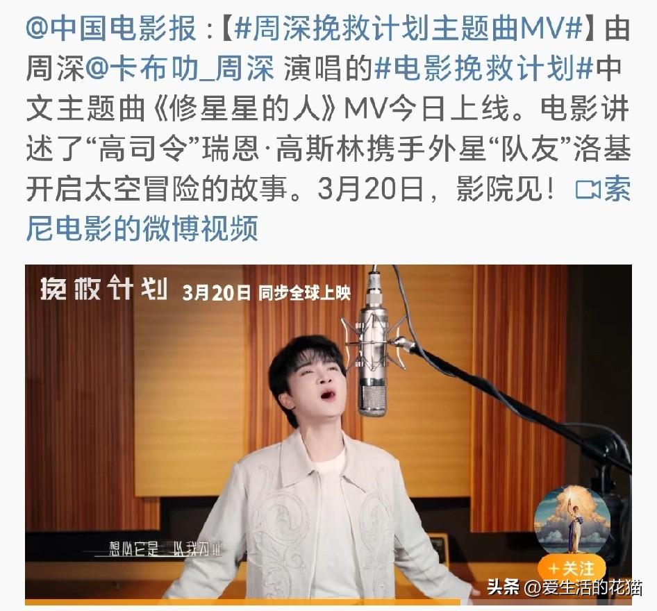 六公主,中国电影报等官媒都陆续报道了周深为电影《挽救计划》演唱中文主题曲《修星星的人》,MV今天正式上线! 这部电影可是“高司令”瑞恩·高斯林主演的,跟他搭档的是外星“队友”洛基,俩人要在太空开启一段超酷的冒险故事。科幻迷们千万别错过! 3月20日,电影院见!到时候不仅能看高司令演太空大片,还能听到深深的天籁之音,想想就超期待!