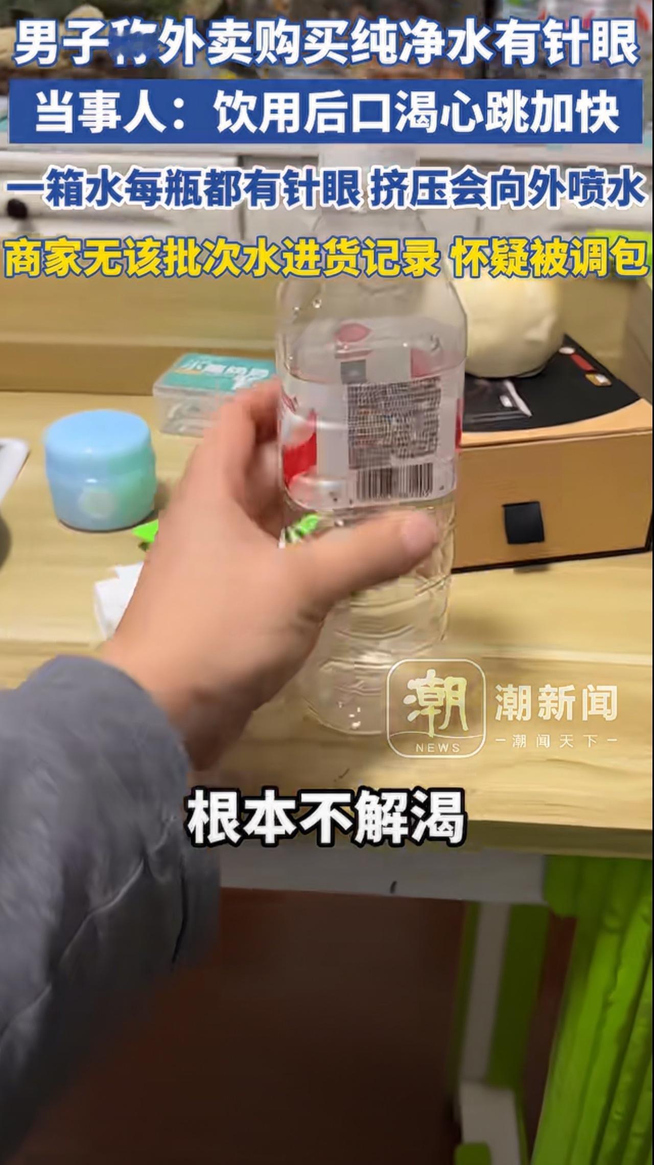 这是有人故意使坏? 想砸娃哈哈的牌子? 近日吉林四平白先生遇到闹心事, 男子称外卖购买纯净水有针眼, 当事人:饮用后口渴心跳加快,一箱水每瓶都有针眼 ,男子拍视频当场挤压会向外喷水,12瓶都有针眼,自己喝了2瓶半,竟然不解渴。 商家表示无该批次水进货记录, 怀疑被调包! 以前遇到过干团购送货的,他们最讨厌买水的人了,钱一样但是水太重,当时总口嗨要给买的人水里下毒下尿,没想到真有人这么干,这是一个怀疑,因为有动机,真这么缺德的很少。 还有就是平时出去吃喝遇到不良商家为了口感,科技调料放多了,牛肉粉,鸡粉,鸡精,这类的科技调料吃了就口渴的冒烟,喝再多水都没用,依然口渴,大家都深有体会。