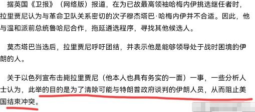 美国中了以色列的计!在拉里贾尼遇袭身亡之后,英媒表示,以色列此举可能是为了阻止美国从战争中撤军。3月18日,英国卫报报道称,拉里贾尼是最高领袖哈梅内伊的亲信。然而,拉里贾尼也有务实的一面,他支持2015年伊朗核协议,并与国内愿意改革的政治力量进行对话。拉里贾尼的离世只会使强硬的反美保守派伊朗革命卫队继续扩大其影响力。 以色列情报机构摩萨德对拉里贾尼的跟踪持续了数周,最终在德黑兰的空袭中完成“斩首”。外界都清楚,拉里贾尼是哈梅内伊生前最信任的亲信,哈梅内伊遇刺后,正是这位前议长临危受命,接过了伊朗最高国家安全委员会秘书的重任,成为战时实际统筹者。他的特殊之处在于,既深得神权阶层信任,又带着革命卫队的军旅背景,却始终保持着务实的政治智慧。 2015年伊核协议的达成离不开拉里贾尼的推动,他在议长任内全力协调各方,让这份协议成为伊朗与西方缓和的重要桥梁。即便在战时,他仍在与国内改革派保持沟通,试图在对抗中为外交留有余地。这样的人物存在,恰恰是美国能够体面撤军的关键——只要拉里贾尼掌权,伊朗就不会彻底倒向激进对抗,外交谈判的窗口就不会关闭。 美国政府原本已经启动中东撤军计划,2026年1月已全面撤出伊拉克政府控制区的军事设施,叙利亚的驻军也进入收尾阶段,计划3到4月撤出最后据点。以色列高层对此极度焦虑,他们深知一旦美国抽身,自己在中东的战略压力将陡增。内塔尼亚胡政府很清楚,拉里贾尼是伊朗体制内唯一能串联政、教、军三方的核心人物,也是美国眼中唯一“值得谈判”的对象。 除掉拉里贾尼,就等于斩断了美国的谈判退路。伊朗总统佩泽希齐扬的哀悼声明已经传递出明确信号,这个国家失去了最关键的“缓冲阀”。没有了拉里贾尼的协调,伊朗内部的权力平衡被彻底打破,温和派的话语权急剧下降,伊朗革命卫队的影响力必然持续扩大。这些强硬派本就主张对美以采取强硬报复,如今更没有了制衡力量。 伊朗革命卫队已经拥有约19万名现役战斗人员,且建立了完善的替代指挥体系,关键职位都预先指定了3到7名候补人选。拉里贾尼死后,决策权不可逆转地向这支武装力量集中,他们必然会推动更猛烈的报复行动,包括动用更多弹道导弹和无人机袭击以色列本土及美国中东基地。 美国现在彻底陷入两难。撤军意味着此前的战略投入全部白费,还会让盟友以色列陷入孤立;增兵则会重蹈战争泥潭的覆辙,陷入与伊朗的长期对抗。英国卫报的分析一语中的,以色列就是通过这种方式,把美国死死绑在中东战场。 国际社会都能看出,以色列的“斩首”行动不是单纯针对伊朗,而是一场精心策划的战略绑架。拉里贾尼的遇刺让伊朗失去了务实对话的核心,也让美国失去了撤军的最佳契机。伊朗革命卫队的激进转向已经不可避免,他们会通过激活地区代理人网络,扩大对美以目标的袭击范围。 美国政府此刻肯定明白自己中了计,但已经没有回头路。伊朗的报复性打击随时可能到来,霍尔木兹海峡的航运安全面临严重威胁,中东局势的动荡只会进一步升级。以色列成功用一场刺杀,迫使美国放弃了撤军计划,把这个超级大国重新拖入了中东的冲突漩涡。 这场博弈的最终结果,是务实派的倒下和强硬派的崛起。拉里贾尼的离世不仅是一个人的悲剧,更是中东缓和希望的破灭。美国被以色列绑上战车,伊朗彻底倒向激进对抗,整个地区的和平前景变得更加渺茫。
