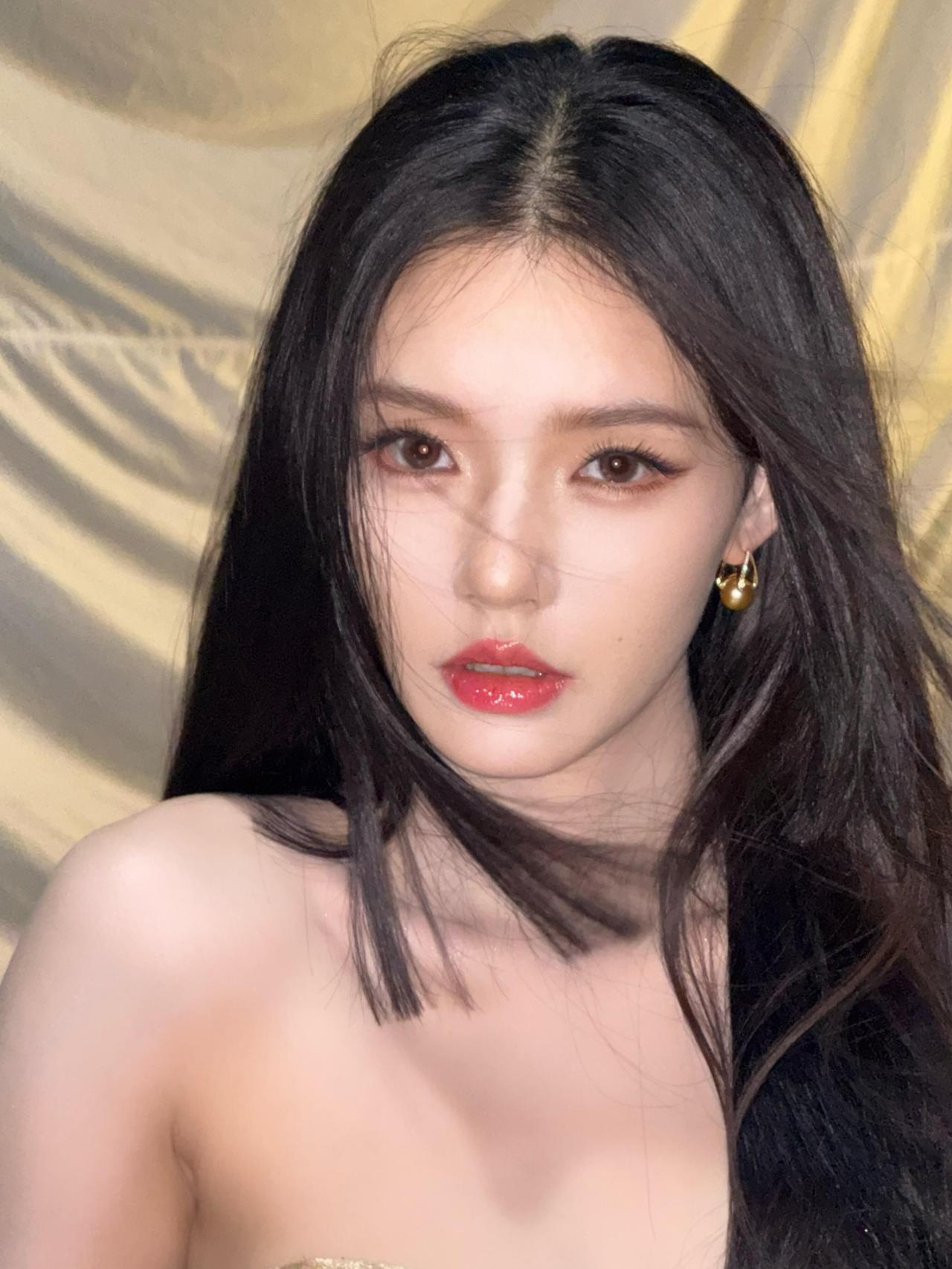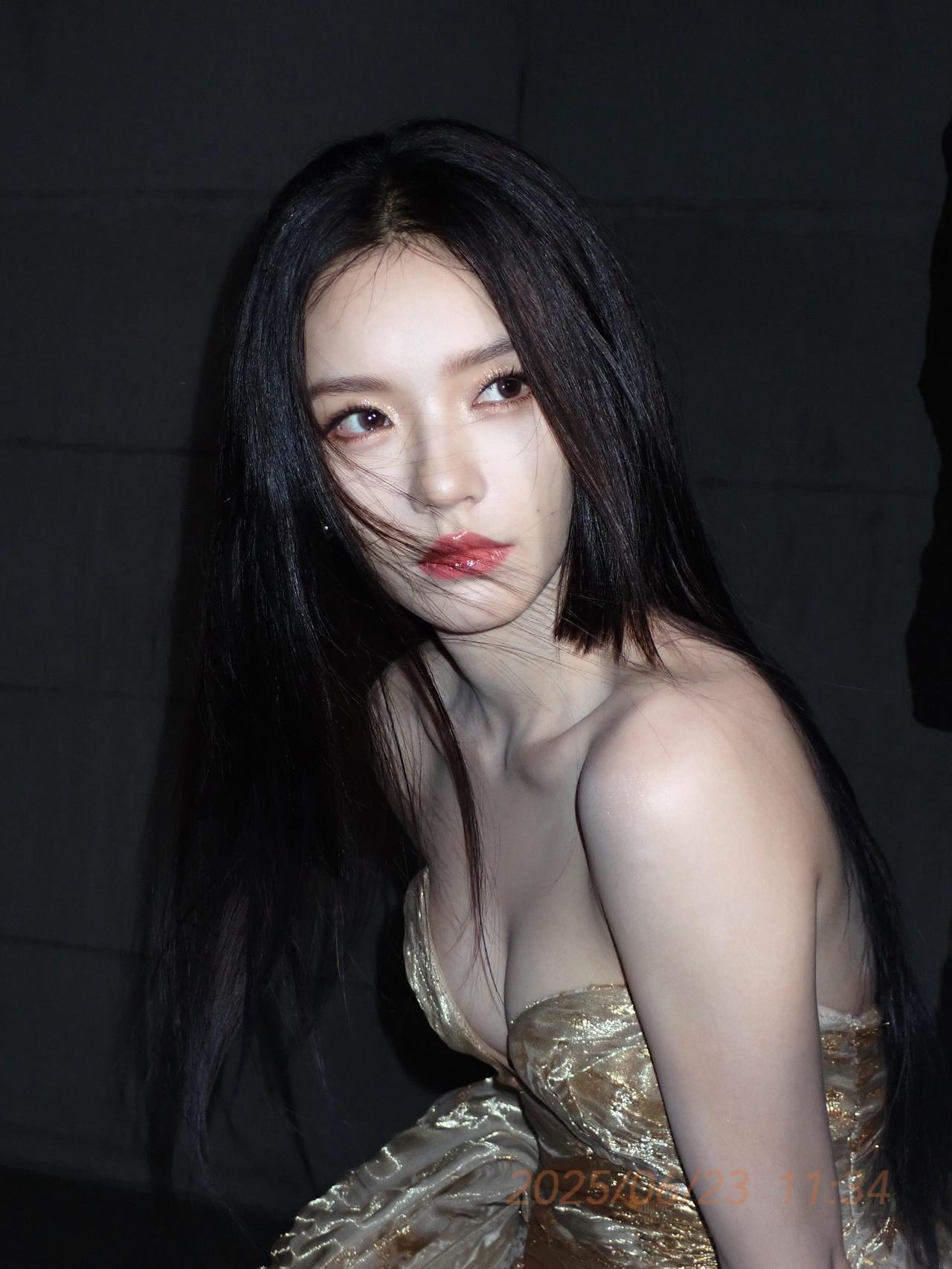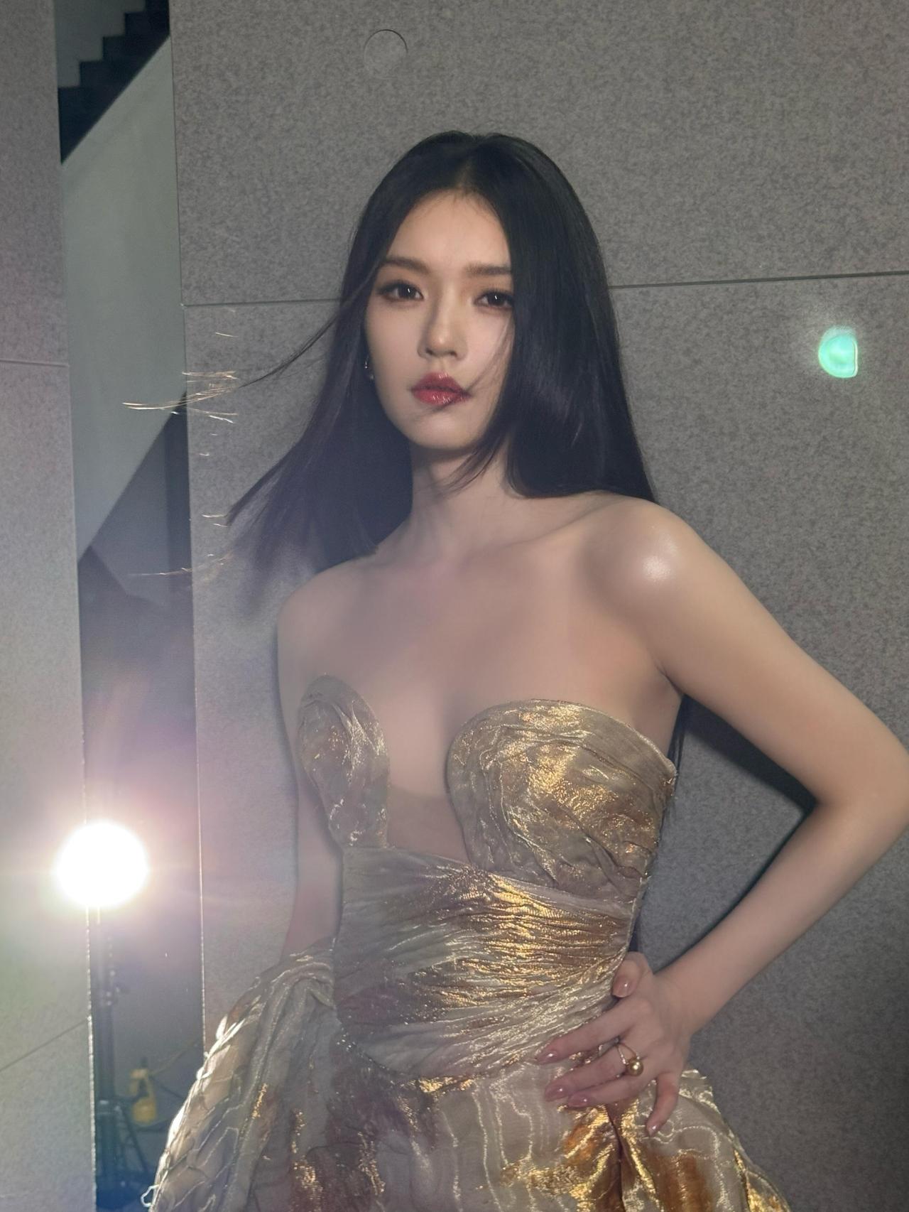 林允 黑发散落如夜的帘幕 遮住半片欲言又止的光 金箔在裙裾上流淌 像把黄昏揉碎,缝进衣袂的褶皱里 眼尾沾着星子的碎末 唇瓣是未燃尽的晚霞 风偷吻过发梢 把心事吹成镜面上的蛛网 每一根银丝都缠着未说出口的刹那 灯光漫过肩线 在锁骨处漾开细碎的浪 你低头时,世界都轻了 只剩鎏金与夜色 在镜头里,慢慢对坐成诗