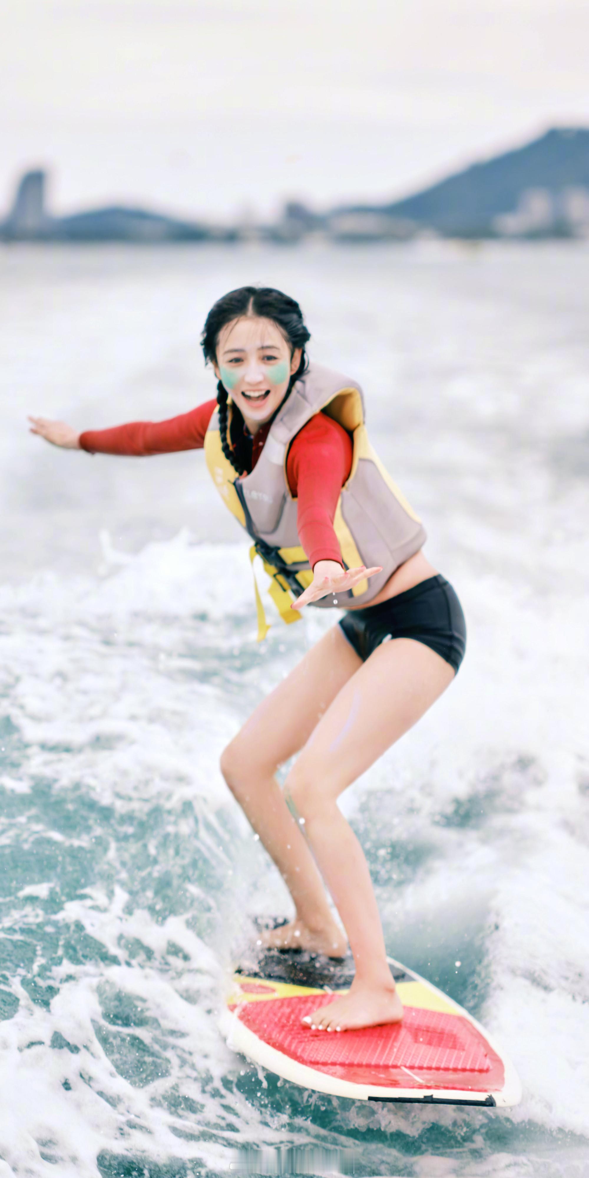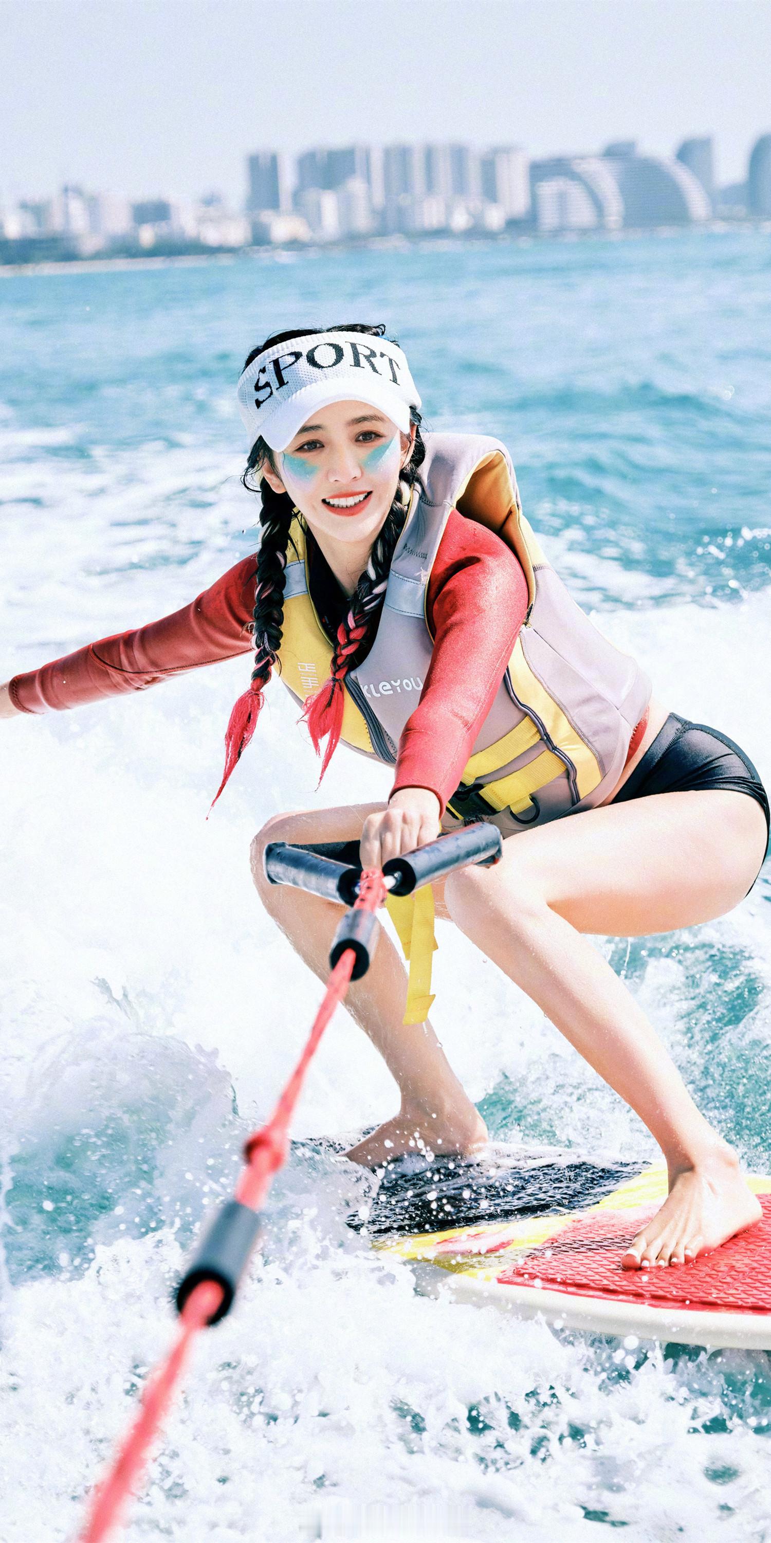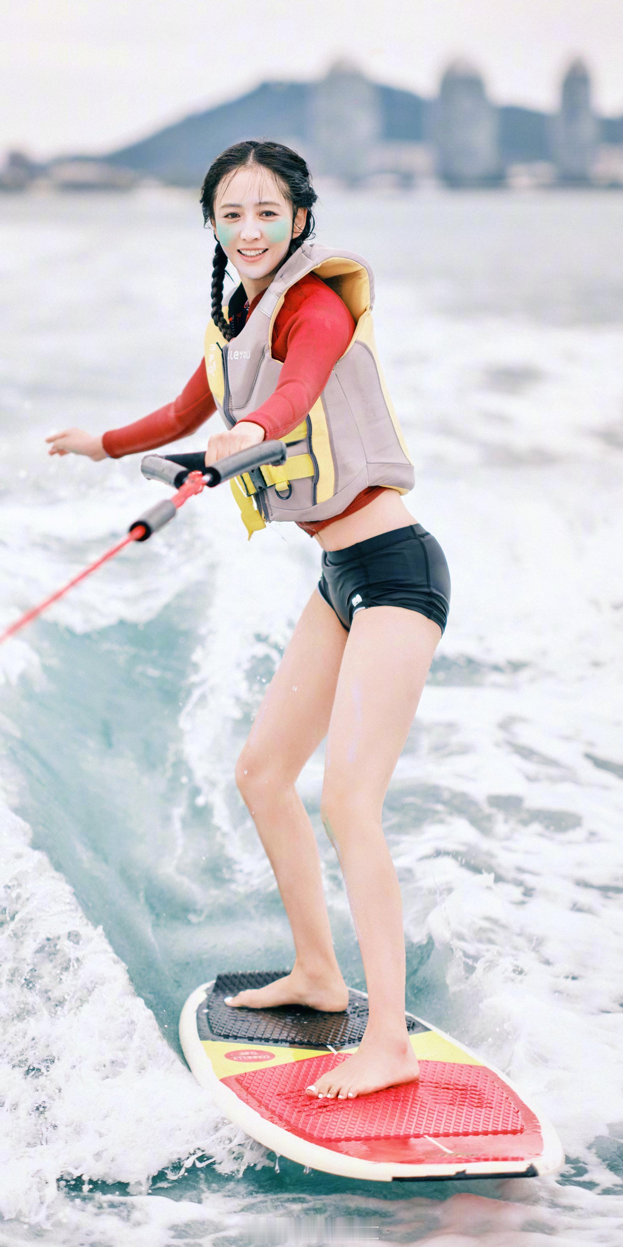 佟丽娅穿黑色泳裤冲浪俏皮甜美 热图阁公众号