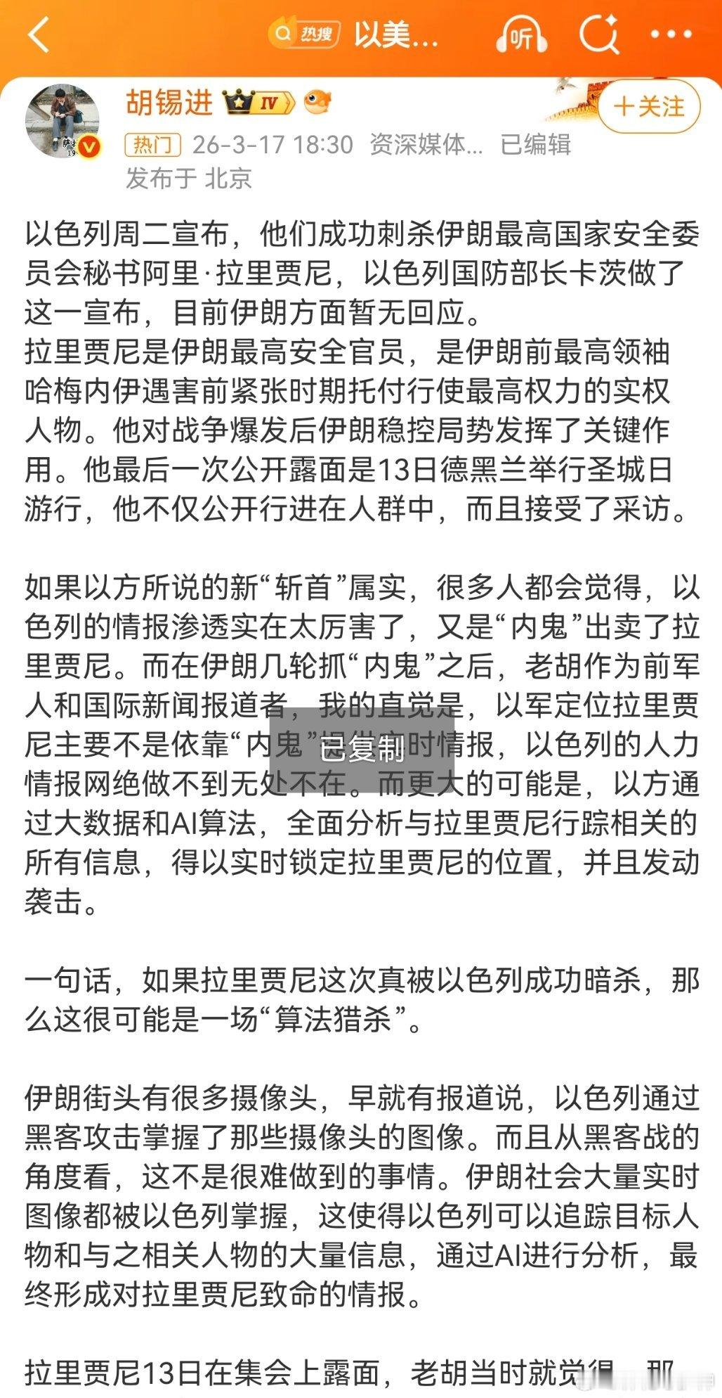 胡锡进:如果以方所说的新“斩首”属实,很多人都会觉得,以色列的情报渗透实在太厉害了,又是“内鬼”出卖了拉里贾尼。而在伊朗几轮抓“内鬼”之后,老胡作为前军人和国际新闻报道者,我的直觉是,以军定位拉里贾尼主要不是依靠“内鬼”提供实时情报,以色列的人力情报网绝做不到无处不在。而更大的可能是,以方通过大数据和AI算法,全面分析与拉里贾尼行踪相关的所有信息,得以实时锁定拉里贾尼的位置,并且发动袭击。