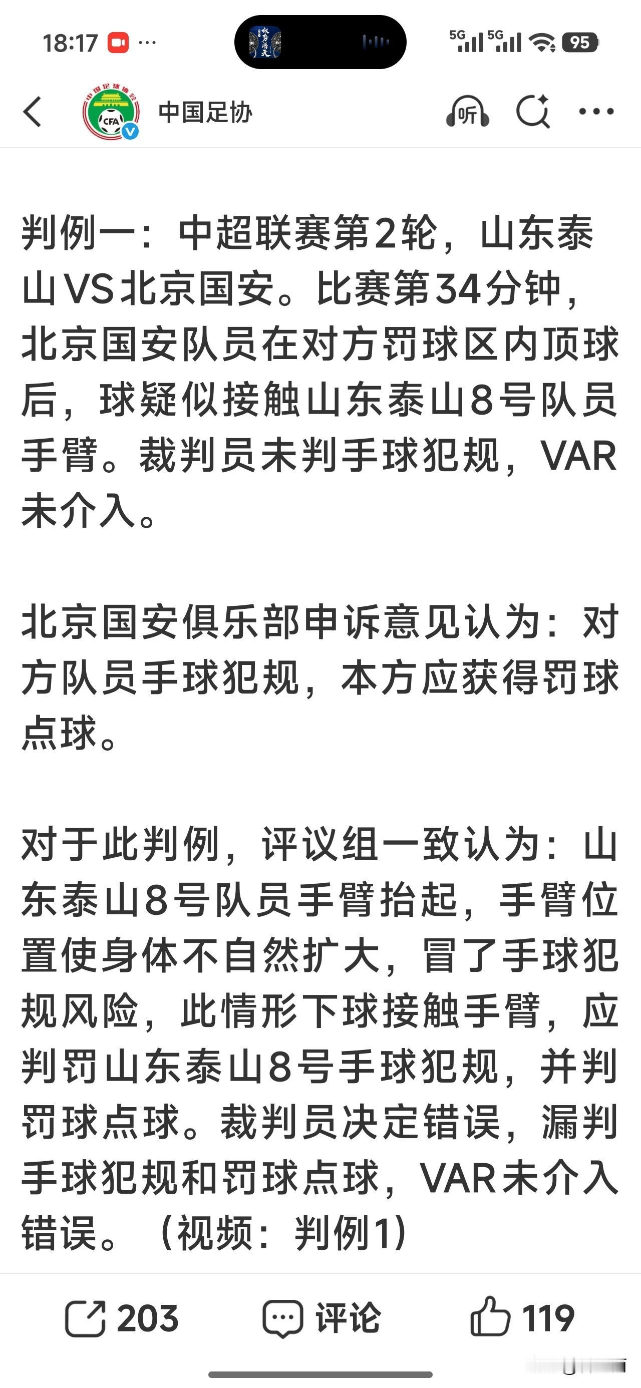 果然京鲁大战中山东泰山在禁区里手球犯规了,中国足协裁判评议委员会认定当值主裁判麦麦提江和VAR裁判唐顺齐漏判了这例手球犯规。 从足协给出的视频,8号马特鲁加加手球非常明显,那么即便麦麦提江没看见,视频裁判唐顺齐也应该通过几路视频观察到啊! 那他为什么不提醒麦麦提江看回放呢? 麦麦提江是近几年继马宁后有一位出色的裁判,吹罚一些中超重要比赛,那么这次漏判,麦麦提江和唐顺齐肯定会被内部处罚了。 也就是说以后麦麦提江执法重要比赛的机会不多了。 京鲁大战非常精彩,双方为球迷贡献了一场荡气回肠的大战,但无疑裁判改变了比赛结果,可以说是本场比赛最低级的环节。 裁判水平低可真是影响中国足球的一个原因。 这场比赛的结果也或许会影响本赛季的争冠形势,山东泰山运气不错,看来真是要夺冠了。